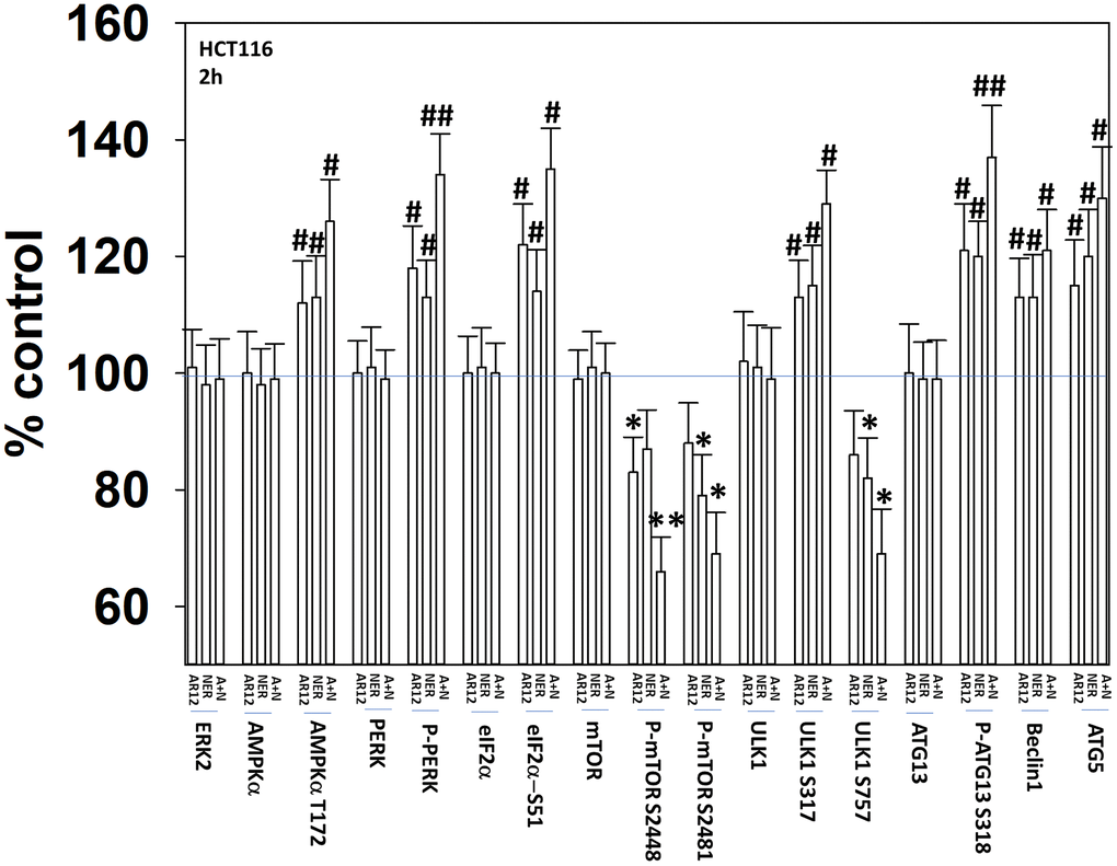 Our initial studies were designed to demonstrate that AR12 and neratinib, and fingolimod and MMF, interacted to cause autophagosome formation and autophagic flux. Treatment of HCT116 ATG16L1 T300 colon cancer cells with AR12 or neratinib increased the activities of the AMPK, ULK1 and ATG13 (Figure 2). The activities of mTORC1 and mTORC2 declined. The drugs combined to cause further activation of PKR-like endoplasmic reticulum kinase (PERK) that was associated with increased phosphorylation, and inactivation of eIF2α.