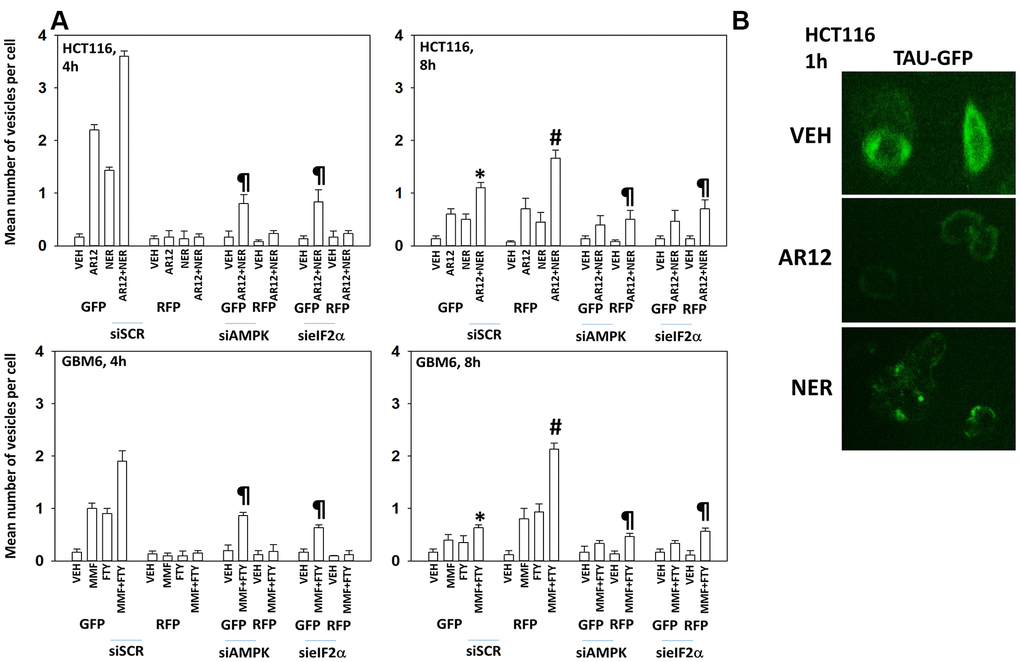 In transfected GBM6 cells, fingolimod and MMF both enhanced autophagosome formation, with the combination causing greater levels of autophagy, and these effects were blocked by knock down of AMPKα1 or eIF2α (Figure 3A, lower graphs). As was observed in the upper graphs, the fingolimod / MMF drug combination caused autophagic flux which was again blocked by knock down of AMPKα1 or eIF2α. From Addgene we purchased plasmids to express a Tau-GFP fusion protein (“wild type”) and to express a mutant Tau 301L-GFP fusion protein (“mutant”). HCT116 cells were transfected with a plasmid to express “wild type” Tau-GFP and treated with AR12 or neratinib. Treatment with AR12 reduced Tau-GFP levels, as did neratinib (Figure 3B). AR12 did not apparently alter Tau sub-cellular localization. Our prior studies with neratinib had demonstrated that the drug rapidly caused HER family receptors and RAS proteins to become localized in punctate intracellular vesicles, and in the present studies, neratinib, unlike AR12, also caused Tau-GFP to rapidly exhibit a punctate staining pattern [43].