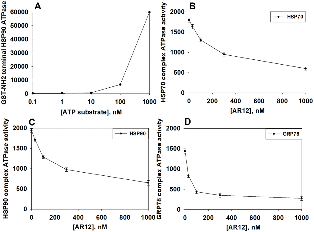 We then performed studies to define dose responses for AR12 inhibiting the chaperone ATPase activities of HSP90, HSP70 and GRP78. As an internal control, we observed a concentration-dependent increase in fluorescence from the ATP-lite substrate (Figure 4A). In a dose-dependent fashion AR12 inhibited the ATPase activities of HSP90, HSP70 and GRP78 (Figure 4B–4D). Of note was that the inherent ATPase activity of GRP78 in our analyses was considerably lower than those of HSP70 and HSP90; the basal activity was significantly less as measured by the assay and was generated by twice as long an incubation compared to HSP90 and HSP70. The approximate IC50 inhibitory concentration for HSP70 was ~400 nM, for HSP90 ~300 nM and for GRP78 ~80 nM. In heavily pre-treated cancer patients treated with AR12, the C max of the drug at the RP2D of 800 mg BID varied between 2 μM and 8 μM. We previously published that AR12 crossed the blood-brain barrier, with a brain C max of ~2 μM after administration of a 50 mg/kg bolus [37]. Collectively, our findings support the use of AR12 as a therapeutic anti-chaperone agent in the brain.