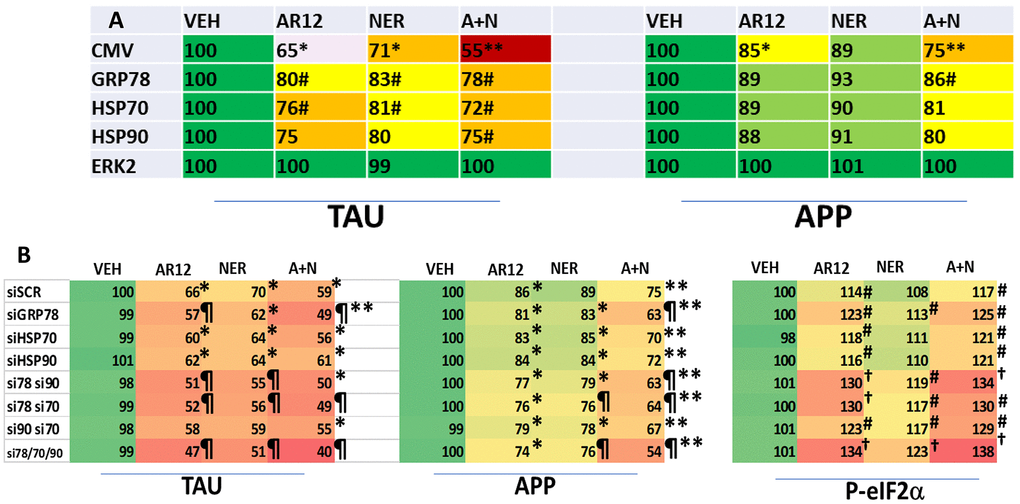 We next performed studies to link chaperone proteins to the expression and drug-induced degradation of Tau and APP. Cells were transfected to over-express GRP78, HSP90 or HSP70 and co-transfected to express Tau or APP. Over-expression of GRP78 and to a lesser extent HSP70 both significantly reduced the ability of AR12, neratinib and the drugs in combination to lower the levels of Tau (Figure 6A). Only GRP78 over-expression significantly reduced the abilities of the drugs as single agents or combined to lower APP expression. Cells were then transfected with siRNA molecules to knock down the expression of GRP78, HSP90 or HSP70, and in combination, and co-transfected to express Tau or APP, followed by drug exposure. Surprisingly, under basal conditions, knock down of GRP78 / HSP90 / HSP70 did not significantly alter the basal levels of Tau or APP expression or the basal levels of sIF2α S51 phosphorylation (Figure 6B). Knock down of GRP78 significantly enhanced the ability of AR12 and [AR12 + neratinib] to reduce the expression of Tau and APP. Knock down of GRP78 in combination with knock down of HSP90 or HSP70 caused significantly more protein degradation than GRP78 alone and a significantly greater amount of eIF2α phosphorylation.