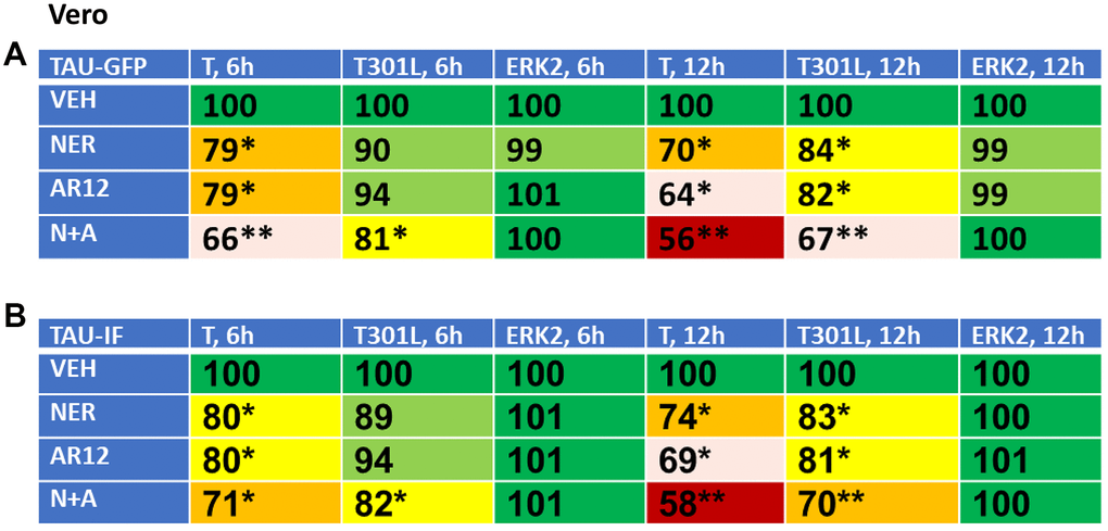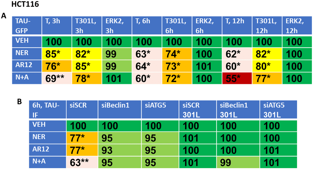 Based on the data in Figure 6, we reasoned that if neratinib and AR12 could inhibit chaperone function and rapidly stimulate autophagosome formation, the drug combination would also be able to degrade other proteins including “wild type” and “mutant” Tau and APP proteins. African Green monkey kidney (Vero) cells and human HCT116 ATG16L1 T300 colon cancer cells were transfected to express “wild type” Tau or a “mutant” Tau, Tau 301L, which has been stated to be relatively protease resistant compared to the wild type protein, with both proteins tagged with GFP [53, 54] (Figures 7, 8). Over a time-course, neratinib and AR12 interacted to reduce the expression of wild type Tau or Tau 301L, either via GFP tag fluorescence or by immunostaining (Figures 7, 8). Transfection of the human HCT116 cells to knock down Beclin1 or ATG5 prevented the drug combination from reducing Tau or Tau 301L expression. Hence, we degrade not only the chaperones which associate with Tau proteins, but also the Tau protein itself (Figure 8B).
