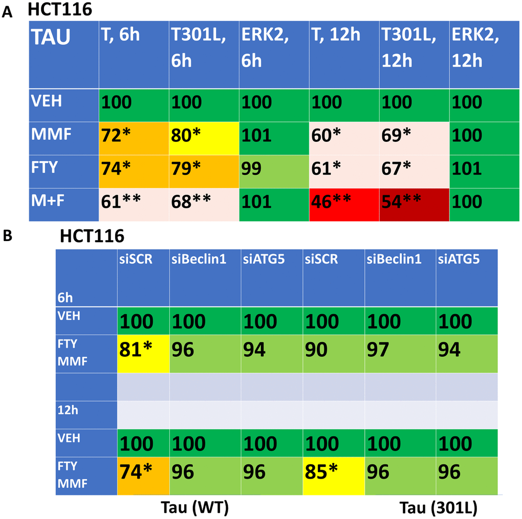 Our oncology studies revealed that the multiple sclerosis drugs fingolimod and dimethyl fumarate interacted to kill glioblastoma cells which was mediated by increased autophagosome formation [47, 48]. The drugs prevented freshly isolated reactive microglia, from a patient GBM tumor, from synthesizing IL-6, TNFα and TGFβ. As the pathologies of AD, ALS and HC all involve sustained expression of denatured toxic proteins, and as our oncology and virology-based drug combinations stimulate autophagosome formation, ER stress and reduced protein translation and autophagic digestion of proteins, we determined whether our repurposed drug combinations using transformed / tumor cell systems, not neurons, could reduce expression of Tau and APP via autophagy.