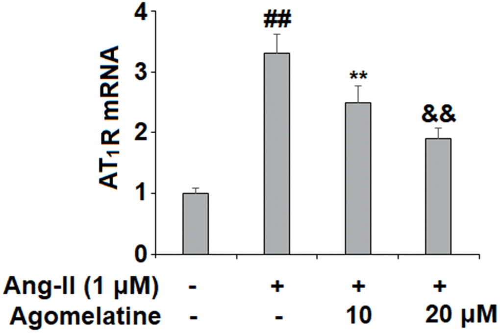 To investigate the effect of Agomelatine in vascular cells, we added Agomelatine in Ang II stimulated endothelial cells. Ang II activates endothelial cells by binding to its type I receptor AT1R on the endothelial surface to induce oxidative stress, endothelial dysfunction, and apoptosis [37, 38]. We hypothesized that the presence of Agomelatine could affect the cellular stress by Ang II. Here, we found that the introduction of 10 and 20 μM agomelatine prevented the increase in AT1R expression induced by exposure to Ang II, with the higher dose having a more robust inhibitory effect (Figure 1).