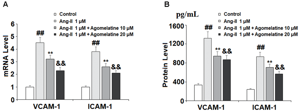 Human umbilical vascular endothelial cells (HUVECs) (Lonza, Basel, Switzerland) and human monocytic leukemia cell line THP-1 cells (ATCC, Manassas, USA) were cultured in EBM-2 medium with 10% heat-inactivated FBS, L-glutamine, and antibiotics (penicillin/streptomycin) (Life Technologies, USA) as previously described [32, 33]. The cells were incubated overnight in a 5% CO2 incubator at a temperature of 37° C. HUVECs were exposed to Ang II (1 μM) with or without agomelatine (10, 20 μM) for 24 h.