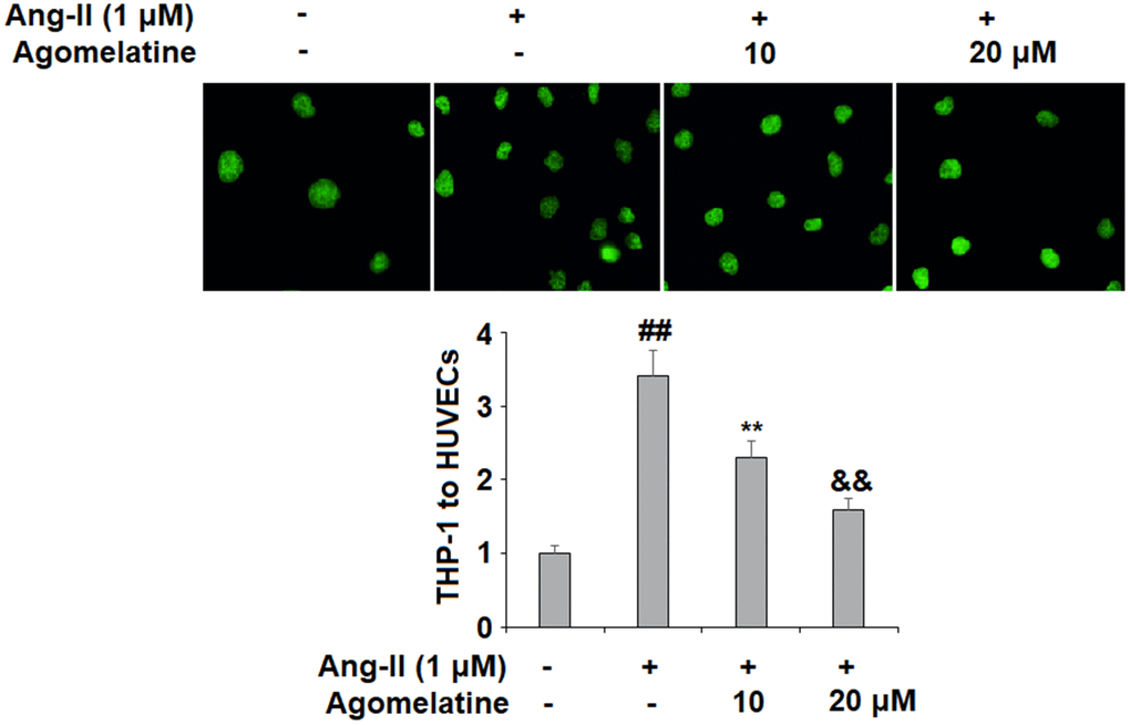 Next, we investigated the effect of agomelatine on Ang II-induced secretion of adhesion molecules and subsequent adhesion of THP-1 monocytes to HUVECs. Real-time PCR and ELISA were used to determine the mRNA and protein levels of VCAM-1 and ICAM-1, two key adhesion molecules. As shown in Figure 2A, 2B, 10 and 20 μM agomelatine dose-responsively inhibited the increase in the mRNA and protein expression of VCAM-1 and ICAM-1 induced by Ang II, respectively. We then performed an adhesion assay experiment to test whether the inhibition of these adhesion molecules by agomelatine results in reduced monocyte adhesion to endothelial cells. Indeed, the results of calcein-AM staining in Figure 3 indicate that agomelatine reduced the number of adhered monocytes in a dose-responsive manner.