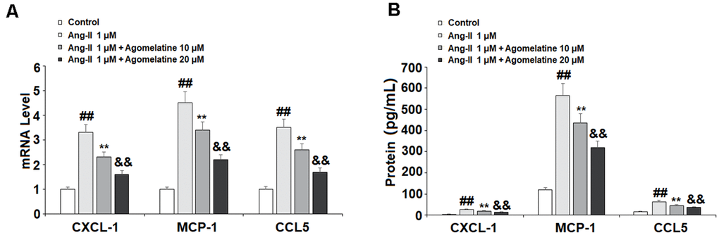 Ang II induces the expression of proinflammatory cytokines and chemokines in endothelial cells. We investigated the effect of agomelatine on the expression of proinflammatory chemokines, including CXCL1, MCP-1, and CCL5. These three chemokines play a major role in the pathogenesis of CVDs by recruiting immune cells to invade the endothelium. The results of real-time PCR and ELISA show that while Ang II significantly increased the mRNA (Figure 4A) and protein (Figure 4B) expression of these chemokines, the two doses of agomelatine ameliorated this effect by roughly half.