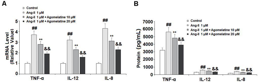 The activated endothelial cells produce high levels of proinflammatory cytokines, which play a critical role in the pathogenesis of CVDs. Therefore, we measured the expression levels of TNF-α, IL-8, and IL-12 in Ang II-challenged HUVECs. As shown in Figure 5A, 5B, Ang II significantly increased the expression of these three cytokines at both the mRNA and protein levels. At the same time, 10 and 20 μM agomelatine dose-responsively suppressed this increase in cytokine expression.