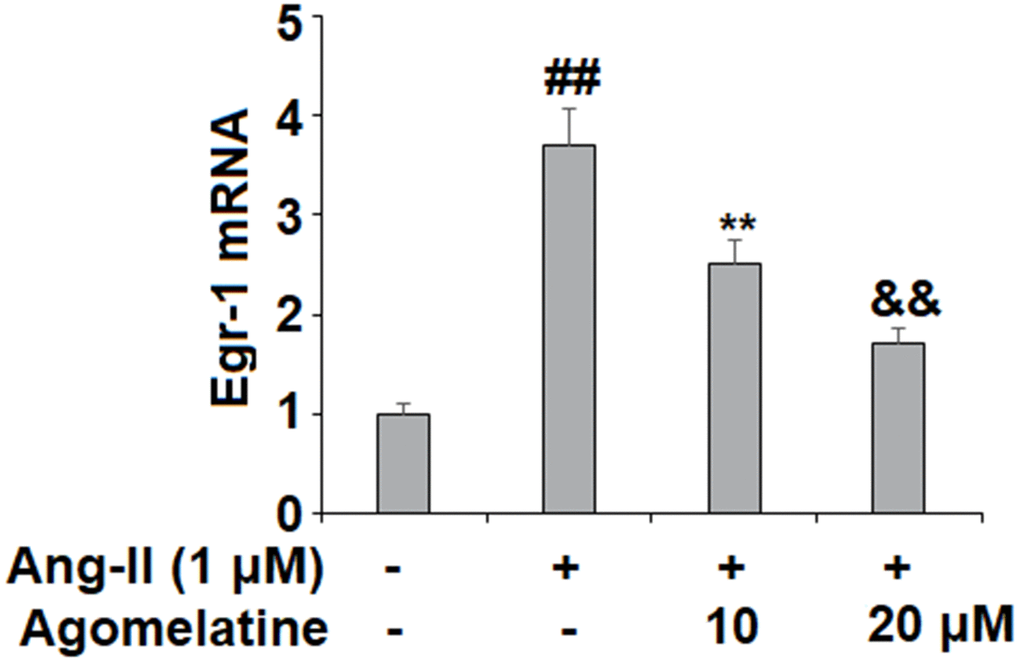 Egr-1 is recognized as a key mediator of Ang II-induced intimal hyperplasia, monocyte adhesion, and atherosclerosis [60]. Increased expression of Egr-1 is also associated with endothelial inflammation, exacerbated oxygen-glucose deprivation/reperfusion-induced injury, and impaired diabetic wound healing capacity [61–63]. Ang II induces the expression of Egr-1 through AT1R/JNK and ERK signaling [64]. The interaction between Egr-1 and agomelatine has not yet been clarified. Melatonin has been shown to downregulate Egr-1 in the pars tuberalis in sheep, thereby influencing circadian gene expression [65]. Here, we demonstrate that agomelatine treatment inhibits Ang II-induced Egr-1 expression. Our findings further demonstrate that the effects of agomelatine against monocyte adhesion to endothelial cells were mediated through Egr-1, as overexpression of Egr-1 abolished the inhibitory effect of agomelatine on adhesion molecules, which was confirmed through a cellular adhesion assay.