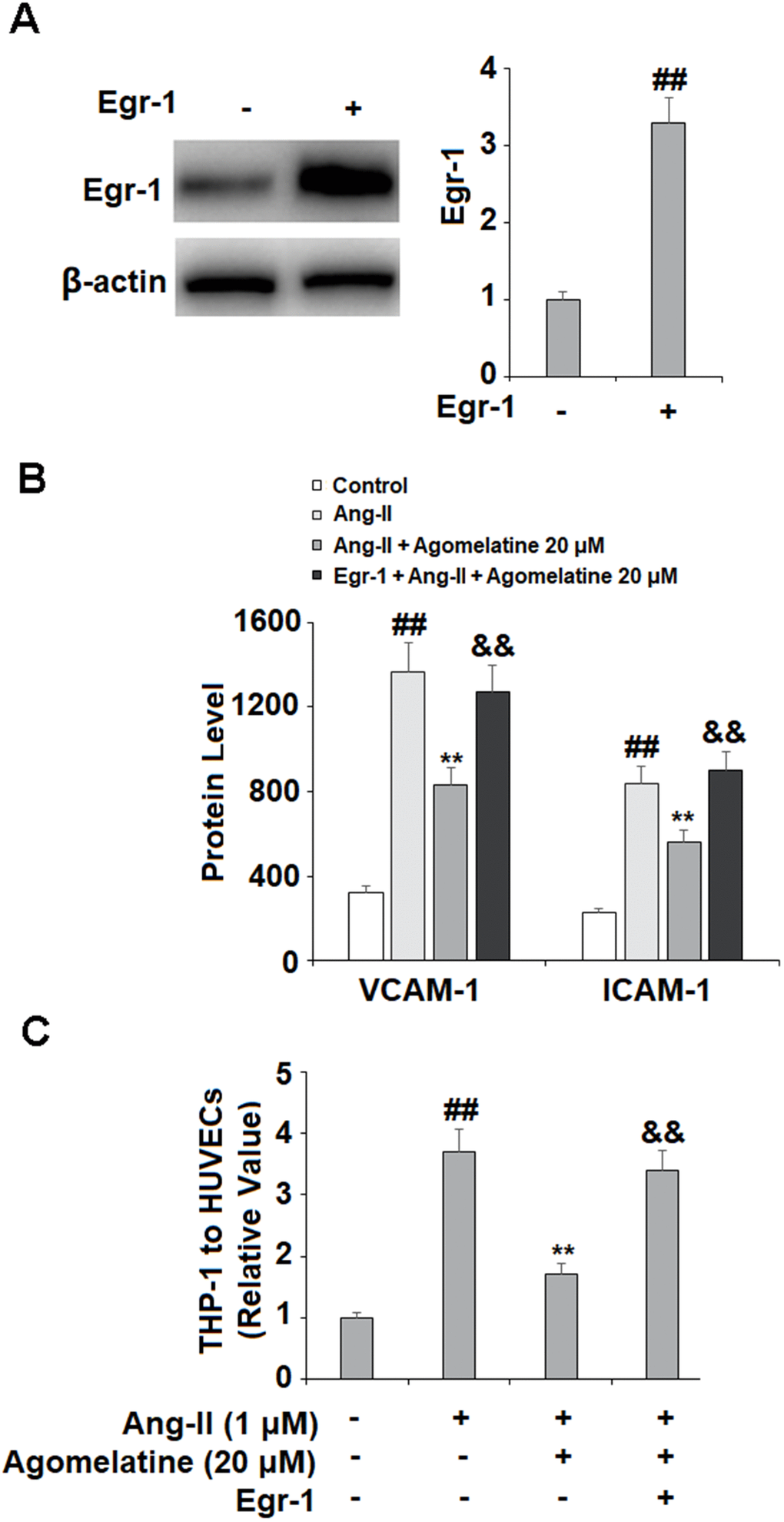 Finally, we set out to determine whether Egr-1 signaling was involved in mediating the inhibitory effects of agomelatine against monocyte-endothelial cell adhesion described above. The results in Figure 6 reveal that while Ang II induced a significant increase in Egr-1, agomelatine dose-responsively ameliorated this effect. To confirm whether this reduction in Egr-1 signaling is involved in the mechanism of agomelatine, we performed an Egr-1 overexpression experiment. The results in Figure 7A–7C demonstrate that overexpression of Egr-1 abolished the activity of agomelatine on the expression of VCAM-1 and ICAM-1 as well as the attachment of monocytes to endothelial cells. Thus, agomelatine inhibits the attachment of monocytes to endothelial cells by reducing adhesion molecule expression through the inhibition of Egr-1.