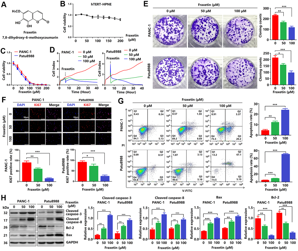 Firstly, CCK-8 assay was performed to investigate the effects of fraxetin on PCC proliferation. As shown in Figure 1B, fraxetin (0~200 μM) was less toxic to hTERT-HPNE cells. While the viability of PANC-1 cells incubated for 24 h gradually decreased when the concentration of fraxetin gradually increased in a concentration-dependent manner. Similarly, the effects of fraxetin on Patu8988 cells were confirmed by CCK-8 results (Figure 1C), especially when the concentration of fraxetin is 25~100 μM. Thus, we selected 50 and 100 μM of fraxetin for subsequent anti-proliferative studies. Based on the RTCA results, fraxetin treatment significantly slowed the growth of PCCs, and the effect was time-dependent (Figure 1D). Moreover, fraxetin significantly reduced the number of colony formation in PANC-1 and Patu8988 cells (Figure 1E). These results supported the anti-proliferative activity of fraxetin in PCCs.