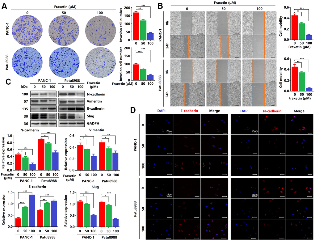 Next, we evaluated the effects of fraxetin on the invasion and migration of PCCs by transwell invasion and wound healing assay. As shown in Figure 2A, in PANC-1 and Patu8988 cells, fraxetin treatment significantly reduced the number of invasive cells in a concentration-dependent manner. In addition, the migration of PCCs was inhibited by fraxetin, and it is concentration-dependent (Figure 2B). Further research revealed that the suppressive effect of fraxetin on the invasion and migration of PCCs might be related to the inhibition of epithelial-mesenchymal transition (EMT). EMT is a developmental process that plays a vital role in PDA progression and metastasis [25]. The EMT is characterized by the loss of cell-to-cell adhesion and is associated with the phenotypic conversion of epithelial cells into mesenchymal-like cells [26]. E-cadherin is the primary adhesion protein associated with epithelial cells and is considered an active suppressor of invasion and growth of PDA [27]. Currently, EMT-associated transcription factor Slug (Snail2), a member of the Snail superfamily, is known to bind directly to the E-boxes of E-cadherin gene promoter and repress its transcription [28]. Thus, we evaluated the expression of E-cadherin and Slug in fraxetin-treated PCCs. E-cadherin expression was enhanced in PCCs upon fraxetin treatment (Figure 2C, 2D). In addition, fraxetin decreased the expression of matrix components, including N-cadherin and Vimentin (Figure 2C, 2D). Moreover, fraxetin reduced Slug expression (Figure 2C). Thus, these data reveal an inhibitory effect of fraxetin on the invasion and migration of PCCs by regulating the EMT process dependent on the Slug-E-cadherin axis.