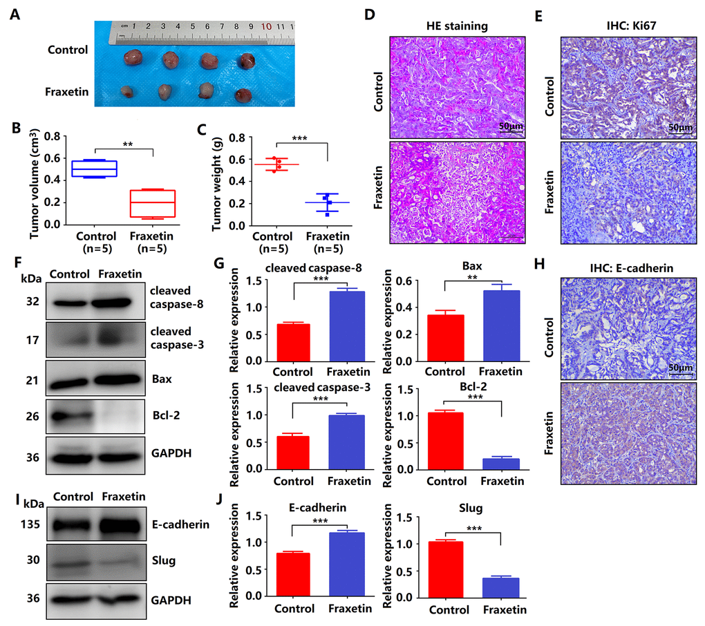 Given fraxetin inhibited the proliferation, migration and invasion, and induced apoptosis of PANC-1 and Patu8988 cells in vitro, whether the similar anti-tumor mechanism of fraxetin occurred in nude mice of PDA xenografts in vivo. Fraxetin (25 mg/kg·d) was administered continuously for 30 days to the mice subjected to the injection of PCCs. The experimental groups underwent morphologic changes as a result of fraxetin treatment, as shown in Figure 3A. The administration of fraxetin significantly reduced the tumor’s volume and weight (Figure 3B, 3C). Evidence from HE-staining showed PDA pathological results in tissues of the model group (Figure 3D). In addition, in fraxetin-treated models, the decreased proportion of Ki67-positive cells in total cells indicated tumor cell proliferation inhibition (Figure 3E). Further research revealed that fraxetin treatment increased the expression of cleaved caspase-8 and cleaved caspase-3 (Figure 3F, 3G). Moreover, fraxetin upregulated Bax expression and downregulated Bcl-2 expression (Figure 3F, 3G). As a result, our in vivo experiments revealed that fraxetin induced PCC apoptosis via mitochondria. To access whether fraxetin suppressed PDA metastasis, we examined the expression of EMT-related proteins. Immunohistochemical analysis showed that fraxetin significantly increased E-cadherin expression (Figure 3H). The enhanced expression of E-cadherin was confirmed by Western Blot results (Figure 3I, 3J). Furthermore, fraxetin reduced the expression of Slug expression (Figure 3I, 3J). Thus, fraxetin inhibited PDA metastasis in animal xenograft models via Slug-E-cadherin-dependent EMT.