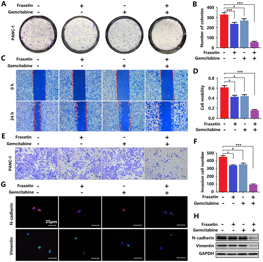 Gemcitabine is currently the first-line drug for PDA chemotherapy, but chemotherapy resistance is widespread and has become the main reason for the failure of PDA chemotherapy [29]. Therefore, it is crucial to inhibit gemcitabine resistance and promote its anti-PDA efficacy. Here, evidence from colony formation assay showed that gemcitabine has a particular inhibitory effect on the proliferation of PCCs, and this effect can be enhanced by fraxetin (Figure 4A, 4B). Besides, fraxetin treatment also strengthens the inhibitory effects of gemcitabine on the infiltration and invasion of PCCs (Figure 4C–4F) by downregulating N-cadherin and Vimentin expression (Figure 4G, 4H). Thus, these findings indicated that fraxetin could enhance the sensitivity of PCCs to the chemotherapy drug gemcitabine.