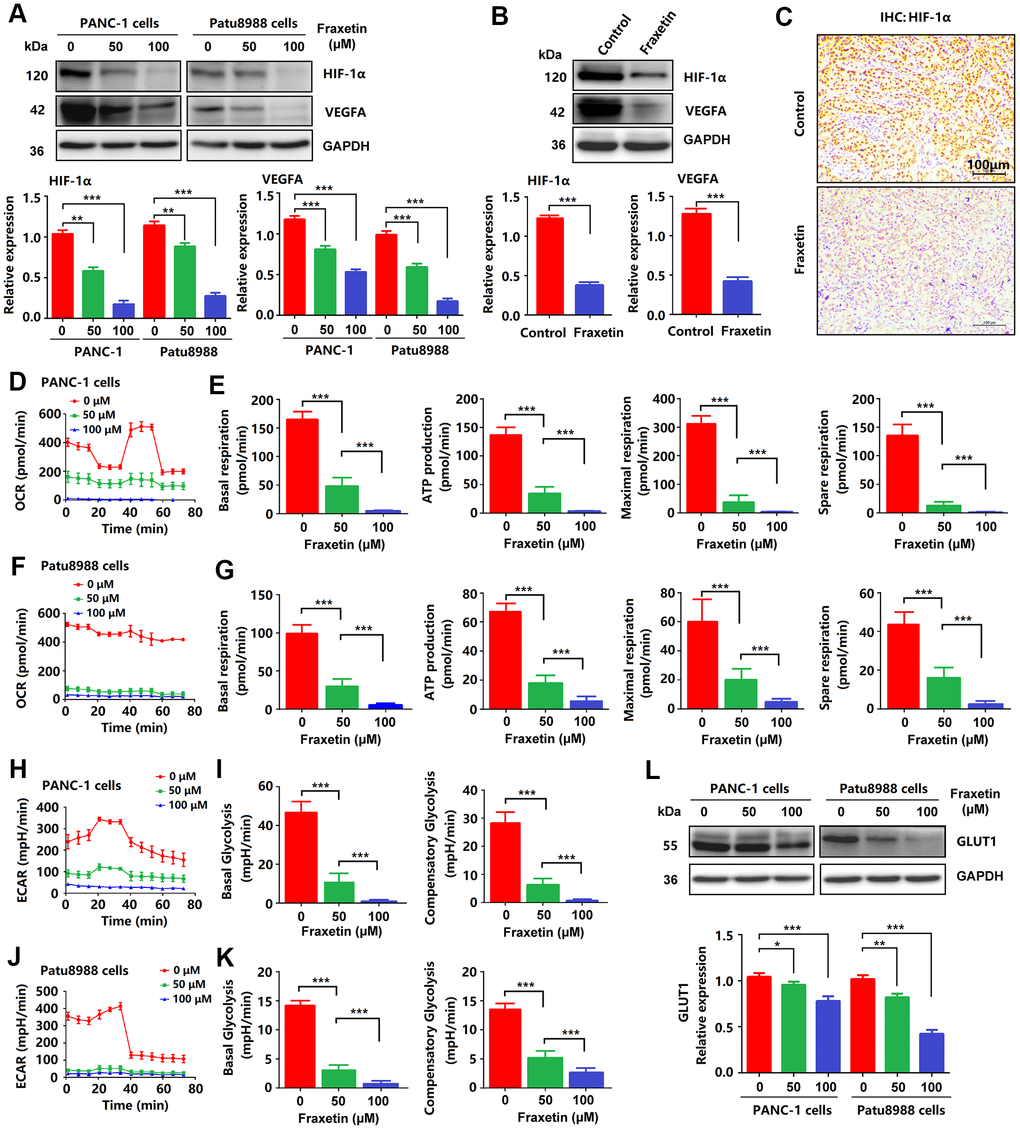 To further clarify the mechanism by which fraxetin exerts its protective effects on PDA by inhibiting STAT3 activation, we analyzed the expression and release of downstream target molecules of this signaling. STAT3 downstream molecules, including Bcl-2, E-cadherin, hypoxia-inducible factor-1α (HIF-1α), and vascular endothelial growth factor-α (VEGFA), are involved in the regulation of cellular proliferation, apoptosis, angiogenesis, and metastasis [10, 32]. As mentioned before, reduced Bcl-2 expression in fraxetin-treated PCCs indicated mitochondrial pathway-dependent apoptosis (Figure 1G). Also, fraxetin inhibits the EMT process by blocking the Slug-E-cadherin axis (Figure 2C, 2D). In addition to these, fraxetin-mediated downregulation in the expression levels of HIF-1α and VEGFA revealed the inhibition of hypoxia-induced angiogenesis (Figure 7A–7C). Moreover, fraxetin treatment reduced the oxygen consumption rate (OCR) in PANC-1 and Patu8988 cells by inhibiting basal respiration, spare respiration, maximal respiration, and ATP production. (Figure 7D–7G). The levels of extracellular acidification rate (ECAR) were decreased by fraxetin by antagonizing basal glycolysis and compensatory glycolysis (Figure 7H–7K). Importantly, reduced expression of glucose transporter type 1 (GLUT1), a uniporter protein that facilitates the transport of glucose across the plasma membranes of mammalian cells for metabolism [33], in fraxetin-treated PCCs was responsible for the reduction of glucose metabolism (Figure 7L). Thus, these findings indicated that in PDA fraxetin hinders hypoxia-induced angiogenesis by decreasing the expression levels of HIF-1α and VEGFA, controlling glucose uptake and metabolism by reducing GLUT1 expression, and inhibiting EMT by blocking the Slug-E-cadherin axis.