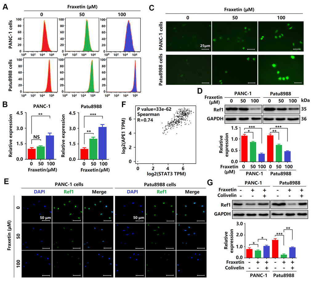 As mentioned above, fraxetin induces cell apoptosis via the Bcl-2-mediated mitochondrial pathway. In PDA, Bcl-2 expression can be regulated by ROS [34]. In this study, we found that the levels of ROS were significantly increased in fraxetin-treated PCCs (Figure 8A–8C), suggesting that fraxetin-induced apoptosis might be mediated by ROS. Further study revealed that downregulated Ref1 expression was involved in ROS-triggered apoptosis of PCCs when exposed to fraxetin (Figure 8D, 8E). Ref1 is a vital target molecule of STAT3 that can regulate ROS levels [35]. We also found that Ref1 expression was positively associated with STAT3 activity in PDA (Figure 8F). Reactivation of STAT3 with colivelin abolished fraxetin-induced downregulation of Ref1 expression in PDA (Figure 8G). Thus, these results indicated that fraxetin drove ROS-mediated apoptosis by regulating the STAT3-Ref1 axis.