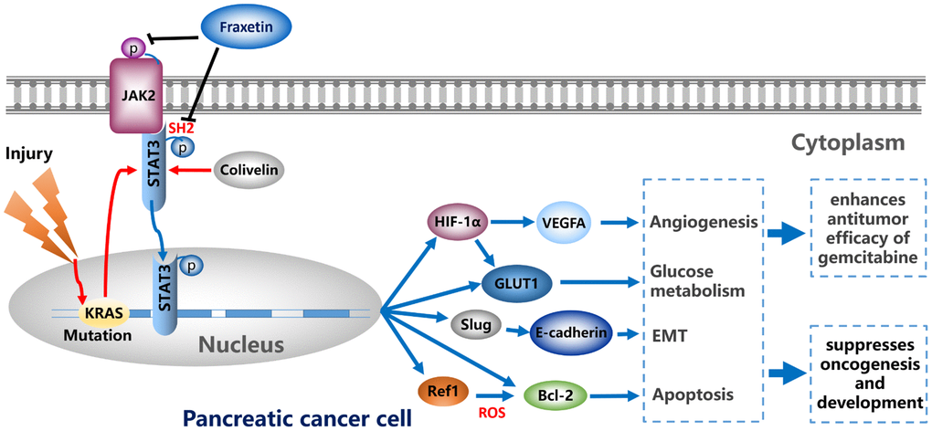 In conclusion, by regulating EMT, fraxetin suppressed PCC proliferation, induced mitochondrial-mediated apoptosis, and inhibited invasion and migration. Fraxetin treatment inhibited PDA growth and metastasis in nude mouse models. Moreover, fraxetin strengthens the anti-tumor effect of gemcitabine by inhibiting PCC proliferation and EMT. Mechanically, oncogenic KRAS-triggered STAT3 activation in PCCs and PDA tissues was suppressed by fraxetin via occupying STAT3 SH2 domain. Consequently, fraxetin hindered hypoxia-induced angiogenesis by decreasing HIF-1α and VEGFA expression, controlled glucose metabolism by reducing GLUT1 expression, inhibited the EMT by blocking the Slug-E-cadherin axis, and drove ROS-mediated apoptosis by regulating STAT3-Ref1 axis. Reactivation of STAT3 reverses the anti-tumor effects of fraxetin (Figure 9). Thus, pharmacological inhibition of STAT3 activity with fraxetin suppresses the oncogenesis and development of PDA by antagonizing STAT3 activation, and fraxetin can be a therapeutic approach to PDA.
