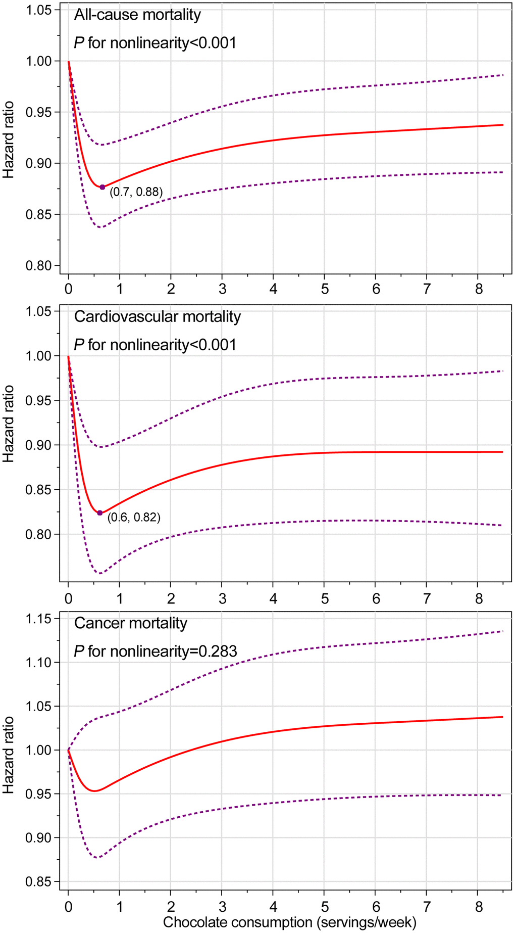Restricted cubic spline functions [65] with four knots located at the 5th, 35th, 65th, and 95th percentiles were used to describe the shape and the nadir of the dose–response curves for the association of chocolate consumption with all-cause and cause-specific mortality, with the reference level set at 0 servings/week. Of note, the choice of the number and location of knots was based on the recommendations by Harrell [66] and Akaike's information criterion [67]. Importantly, for minimizing the potential influence of extreme values, individuals with the top 2.5% of chocolate consumption (i.e., ≥ 9.1 servings/week) were excluded from the dose–response analysis. A Pnonlinearity was obtained by testing the null hypothesis that regression coefficients of the second and third splines were equal to 0 [65].