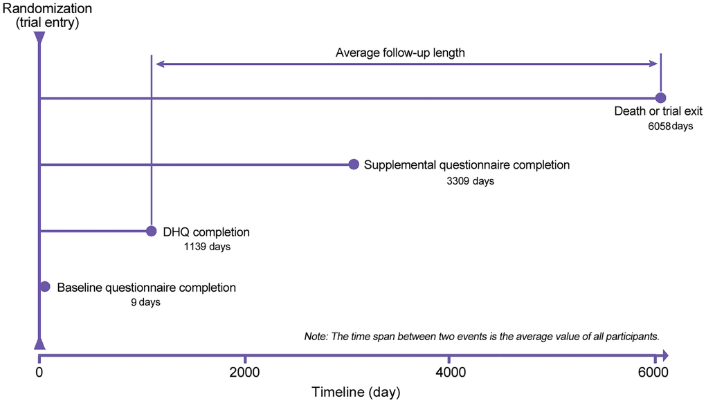 A self-administrated baseline questionnaire was used to collect the following data: sex, marital status, ethnicity, height, body weight, educational degree, family history of cancer, history of diabetes, history of hypertension, aspirin use, and smoking status. Body mass index (BMI) was computed as body weight (kg) divided by height squared (m2). A DHQ (version 1.0, National Cancer Institute, 2007) was used to assess the remaining covariates: age at DHQ completion, alcohol consumption, energy intake from diet, food consumption, and nutrient intake. The DHQ was a self-administered 137-item food frequency questionnaire, which was developed to evaluate the frequency and portion size of food consumption and nutrient intake over the past 12 months. Notably, the validity of the DHQ had been confirmed against four 24-h dietary recalls in The Eating at America's Table Study [55]. Daily food consumption was estimated by multiplying the food frequency by portion size; daily nutrient intake was estimated based on the Nutrition Data Systems for Research [56] and the USDA's 1994-96 Continuing Survey of Food Intakes by Individuals [57]. Healthy Eating Index-2015, an indicator of diet quality, with higher scores indicating higher diet quality, was computed as previously described [58]. Physical activity level was approximated based on the frequency and duration of moderate and strenuous activities, which were collected with a self-administrated supplemental questionnaire. The supplemental questionnaire was introduced in 2006 in the PLCO Cancer Screening Trial; in our study, the mean (standard deviation) time from trial entry to the completion of this questionnaire was 3309 (680) days (Figure 3).