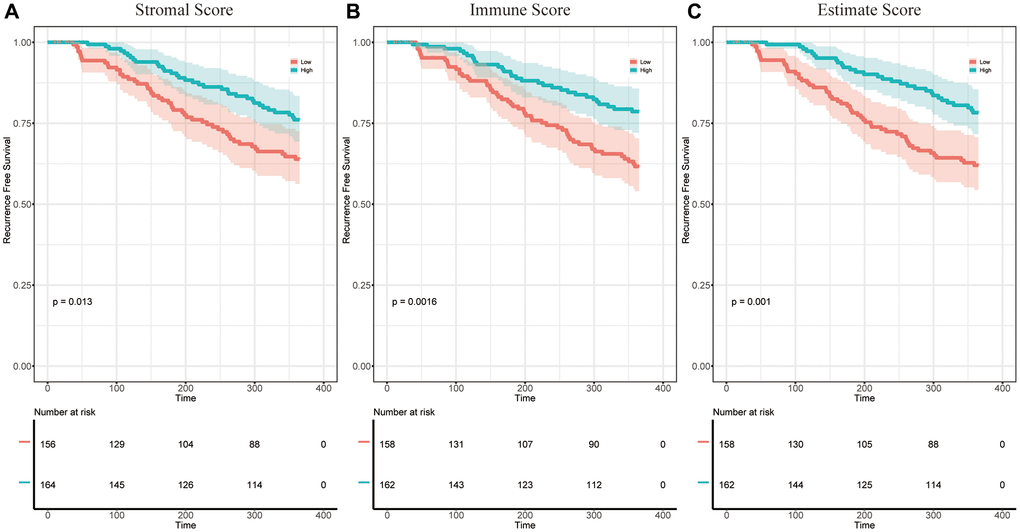Analysis workflow of this study was shown in Figure 1. To identify the correlations among the estimated stromal and immune scores with the RFS of patients with HCC, Kaplan–Meier survival analysis was used for the stromal score, immune score, and estimate score, respectively (the clinicopathological characteristics of the patients with HCC are shown in Supplementary Table 1). According to our analysis, all three scores showed a significant correlation with the 1-year RFS rate of patients with HCC who underwent liver resection (stromal score, p = 0.013, Figure 2A, immune score, p = 0.0016, Figure 2B; estimate score p = 0.001, Figure 2C). We also evaluated the correlation between the scores and the long-term OS of patients with HCC; however, there was no significant difference between the low and high subgroups (Supplementary Figure 1A–1C).