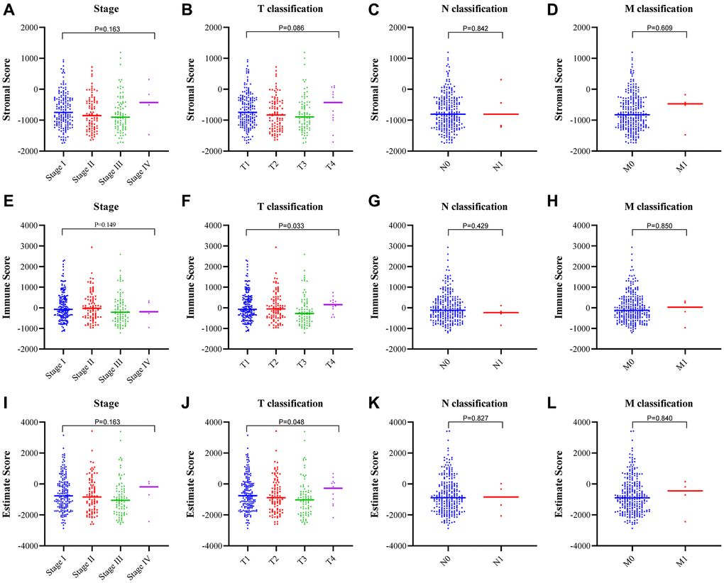 To determine the correlation between the stromal and immune scores and the clinicopathological characteristics, we downloaded the clinical data of 373 patients with HCC from the TCGA database for further analysis (Figure 3A–3L). The immune score and estimate score correlated positively with the T classification of tumor-node-metastasis (TNM) stages (Figure 3F, p = 0.033; Figure 3J, p = 0.048). While the stromal score did not correlate with any classification of HCC (Figure 3A–3D).