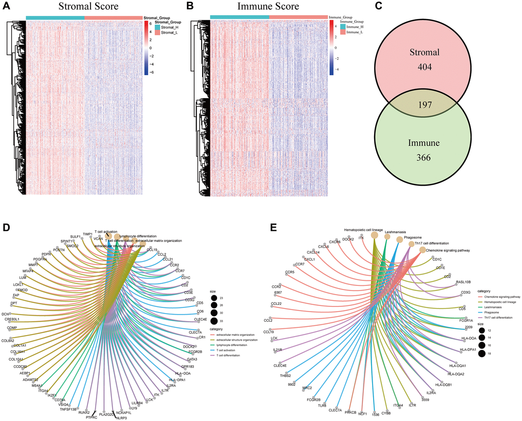 ESTIMATE is an algorithm used to evaluate the tumor purity, which uses the gene expression of an immune signature (141 immune genes) and a stromal signature (141 stromal genes). [46] The ESTIMATE immune score and stromal score were calculated using R package estimate (v.1.0.13) [47] to analyze the infiltration levels of immune cells and stromal cells for each HCC sample, and patients with HCC were divided into high and low score groups based on the median value of immune or stromal score.