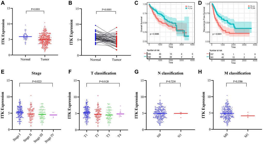 The Mann–Whitney U test showed that ITK expression in HCC tumors was lower than that in normal tissues (P < 0.001; Figure 6A). Differential analysis of 50 paired HCC tumor and paracarcinoma tissues also revealed consistent results (P < 0.001; Figure 6B). All HCC samples (n = 365) were divided into two subgroups based on the median expression level of ITK. Kaplan–Meier survival analysis was carried out to evaluate the predictive capacity of ITK expression. According to the results, patients with HCC in the high ITK group had better 1-year, 3-year, and 5-year OS rates (88.4% vs. 77.4%, 73.5% vs. 52.8%, and 54.0% vs. 40.8%; p = 0.0085, Figure 6C) and RFS (80.1% vs. 59.3%, 59.4% vs. 28.8%, and 46.2% vs. 21.7%; p < 0.001, Figure 6D) compared with those of the ITK low group. We subsequently analyzed the correlation between ITK expression and clinical characteristics. High expression of ITK correlated with earlier clinical stages and better T classification in the TNM stage system (P < 0.05, Figure 6E; P < 0.05, Figure 6F), while there was no significant difference in ITK expression for the N and M classifications (Figure 6G and 6H). HLA-DRB5 expression showed no significant correlation with OS (p = 0.12, Supplementary Figure 4C) or RFS (p = 0.22, Supplementary Figure 4D) according to Kaplan–Meier survival analysis. HLA-DRB5 expression was not correlated with TNM staging either (Supplementary Figure 4E–4H).