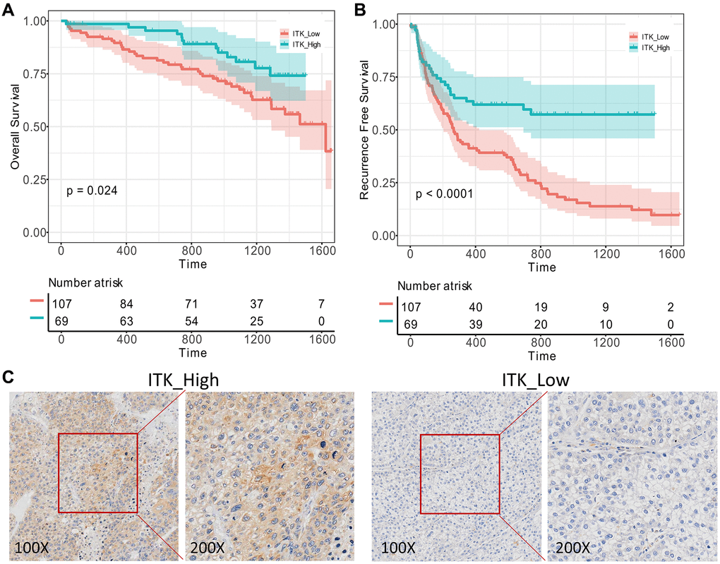 Immunohistochemistry (IHC) analysis proved that high ITK levels predict better postoperative outcomes of patients with HCC