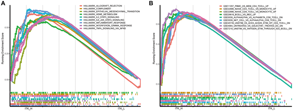 The ITK expression level was related to the prognosis and clinicopathological stages of patients with HCC; therefore, we applied Gene Set Enrichment Analysis (GSEA) analysis to determine the underlying mechanisms. As shown in Figure 8A, in the ITK high group, the genes were mainly enriched in inflammatory activities, including interleukin (IL)-2/signal transducer and activator of transcription 5 (STAT5) signaling, interferon-alpha response, and IL-6/Janus kinase (JAK)/STAT3 signaling pathways. The genes in the high ITK subgroup were enriched in multiple immunological gene sets according to the C7 collection defined by MSigDB (Figure 8B, the detailed information is shown in Supplementary Table 3).