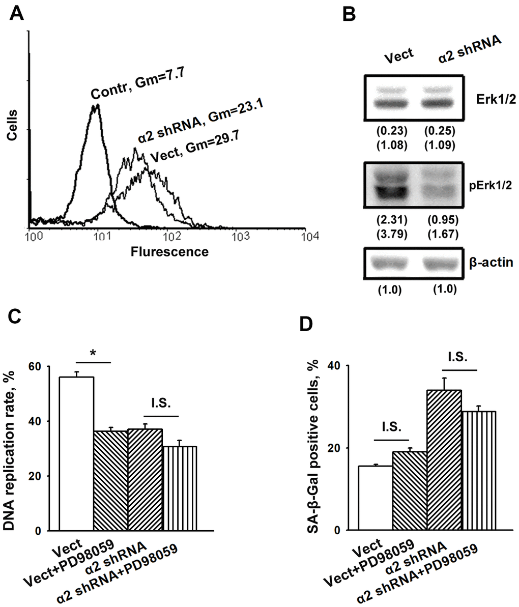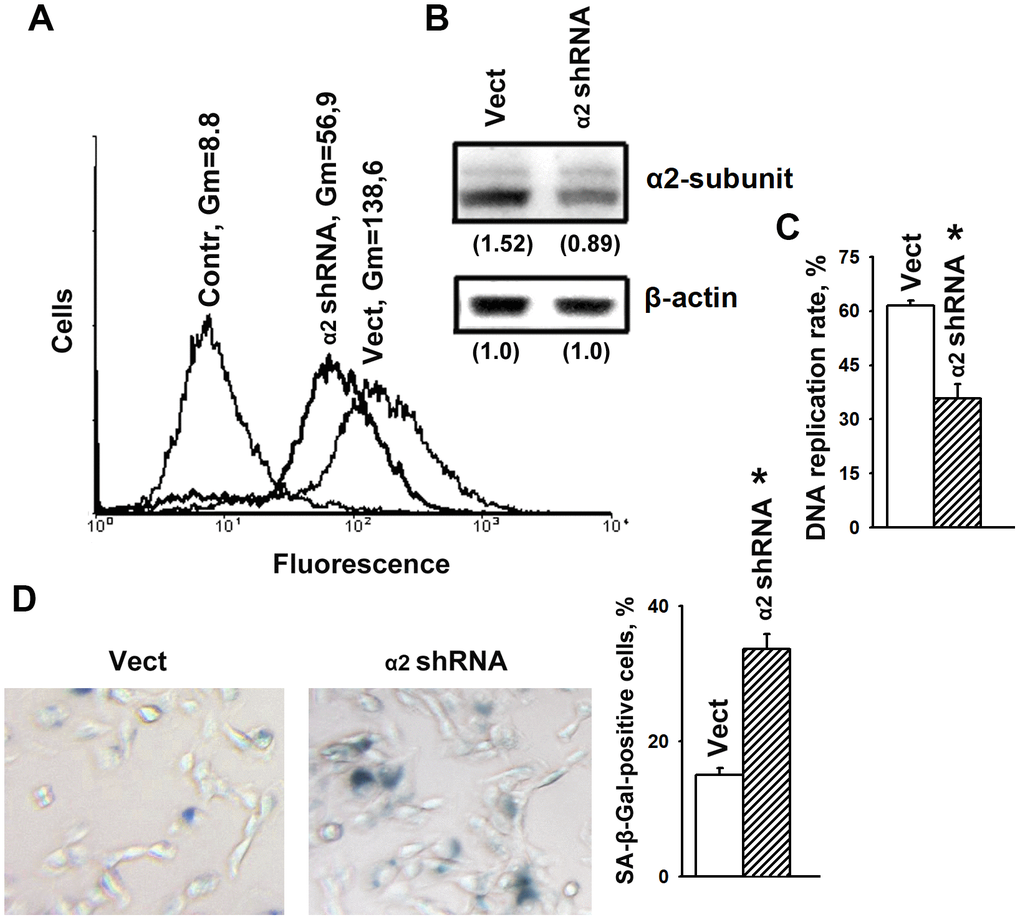 To determine the effects of α2β1 upon the mechanisms of senescence, we assessed the effect of its downregulation on the activity of beta-galactosidase, a typical marker of senescence. Suppression of this integrin was carried out by transducing the cells with a plasmid clone expressing α2-specific shRNA. Western blot and flow cytometry data showed high efficiency of the used clone (Figure 1A, 1B). As shown in Figure 1C, 1D, blocking the expression of α2β1 led to a sharp increase in cellular senescence, as well as a significant decrease in the proliferation of the cells. Inhibition of proliferative activity is a typical trait of cellular senescence.