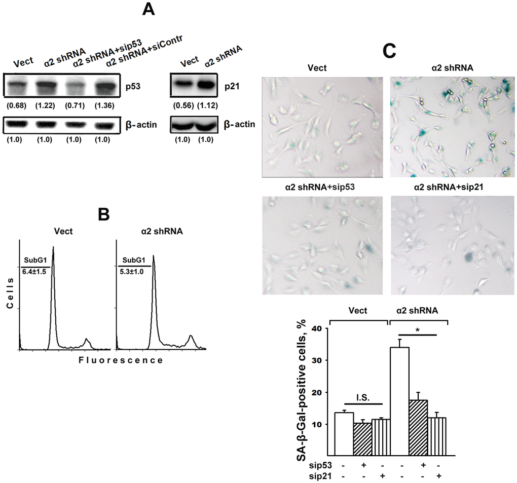 It could be assumed that the effect of a2β1 downregulation on senescence was not due to increased p53/p21 signaling but instead was initiated by another signaling pathway, such as p16/Rb. To clarify this issue, we investigated the effect of blocking the expression of each of these proteins on the senescence of SK-Mel-147 cells with reduced α2β1 expression. As seen in Figure 2A, in cells lacking α2β1, siRNA-induced silencing of p53 reduced the expression of this protein to the level of control cells and, as evidenced in Figure 2C, suppression of p53 and p21 sharply reduced the ratio of senescent cells in the α2β1-downregulated population. In cells with intact α2β1, the effect of sip53 and sip21 was insignificant most likely because of already low senescence of these cells.