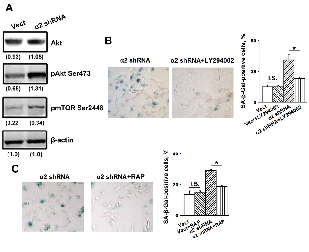 We suggested that enhanced activity of these protein kinases is not just a trait accompanying increased senescence but rather can be attributed to their involvement in the mechanisms of senescence. To verify this suggestion, we investigated the effect of inhibitors of the Akt/mTOR pathway on senescence in melanoma cells depleted of α2β1. To block this pathway, the cells were treated with a PI3K inhibitor (LY294002) and an mTORC1 inhibitor (rapamycin). As shown in Figure 4B, 4C, the suppression of PI3K/Akt/mTOR signaling significantly attenuated senescence induced by α2β1 knockdown in SK-Mel-147 cells. Thus, signals transmitted by PI3K/Akt/mTOR play an important role in senescence induced by α2β1 integrin deprivation.