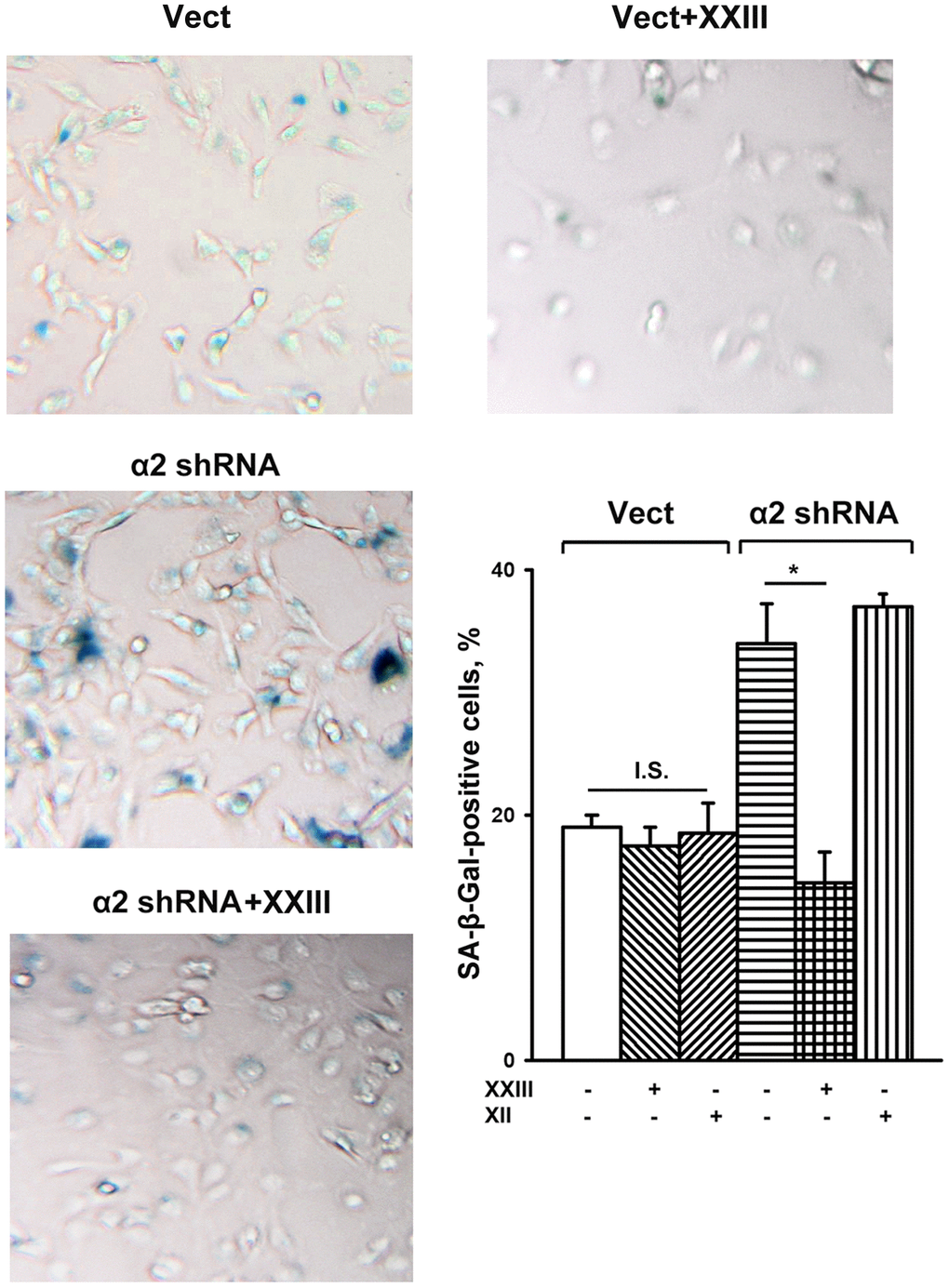 Cells were plated in 12-well plates for 24 h, rinsed in PBS, fixed and incubated overnight at 37° C with the staining solution containing the X-Gal substrate (BioVision, USA). The development of blue color was detected visually under the microscope and the cells staining positive for SA-β-Gal were counted as a percentage of the total cell number. The images were captured and processed using Adobe Photoshop CS5.