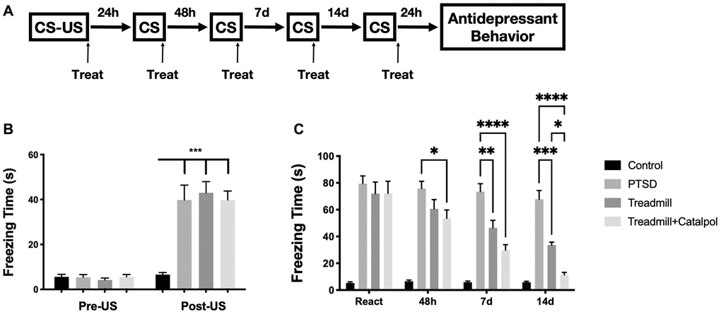 We used the fear learning to mimic the development of the PTSD. The conditioned stimulus combined with unconditioned stimulus (US) were firstly performed for establishing the panic memory of the animal. Then the repeat conditioned stimulus (CS) to mimic the post-traumatic stress disorder [17]. The treadmill and treadmill combined with catalpol administration were performed right after each CS. After 4 times of the CS and the treatment, the mice were then performed with the antidepressant and cognitive tests (Figure 1A). Compared with CS, the freezing time of the mice after US showed the dramatic increase relative with control group (Figure 1B, two-way ANOVA, Tukey’s post-hoc test, PTSD vs. Control: p < 0.001). Such result indicates the successful establishment of the PTSD model. Following the CS sections after US, the catalpol was administrated to the mice with oral gavage previous treadmill. Treadmill combined with catalpol administration displayed the significant therapeutic effects to decrease the freezing time after 48 h, and such effect continued until the end of the CS protocol (Figure 1C, two-way ANOVA, Tukey’s post-hoc test, treadmill + catalpol vs. PTSD: p < 0.05 at 48 h, p < 0.001 on day 7 and day 14). Although treadmill administration alone also present the attenuating effects to freezing time, the significance did not show 48 h after the US. Moreover, on day 14 the freezing time also remarkably longer than combination group (Figure 1C, two-way ANOVA, Tukey’s post-hoc test, treadmill vs. PTSD: p < 0.01 on day 7 and day 14; treadmill vs. treadmill + catalpol: p < 0.05 on day 14). Collectively, catalpol treatment significantly promote the effects of the treadmill running in attenuating PTSD syndrome.