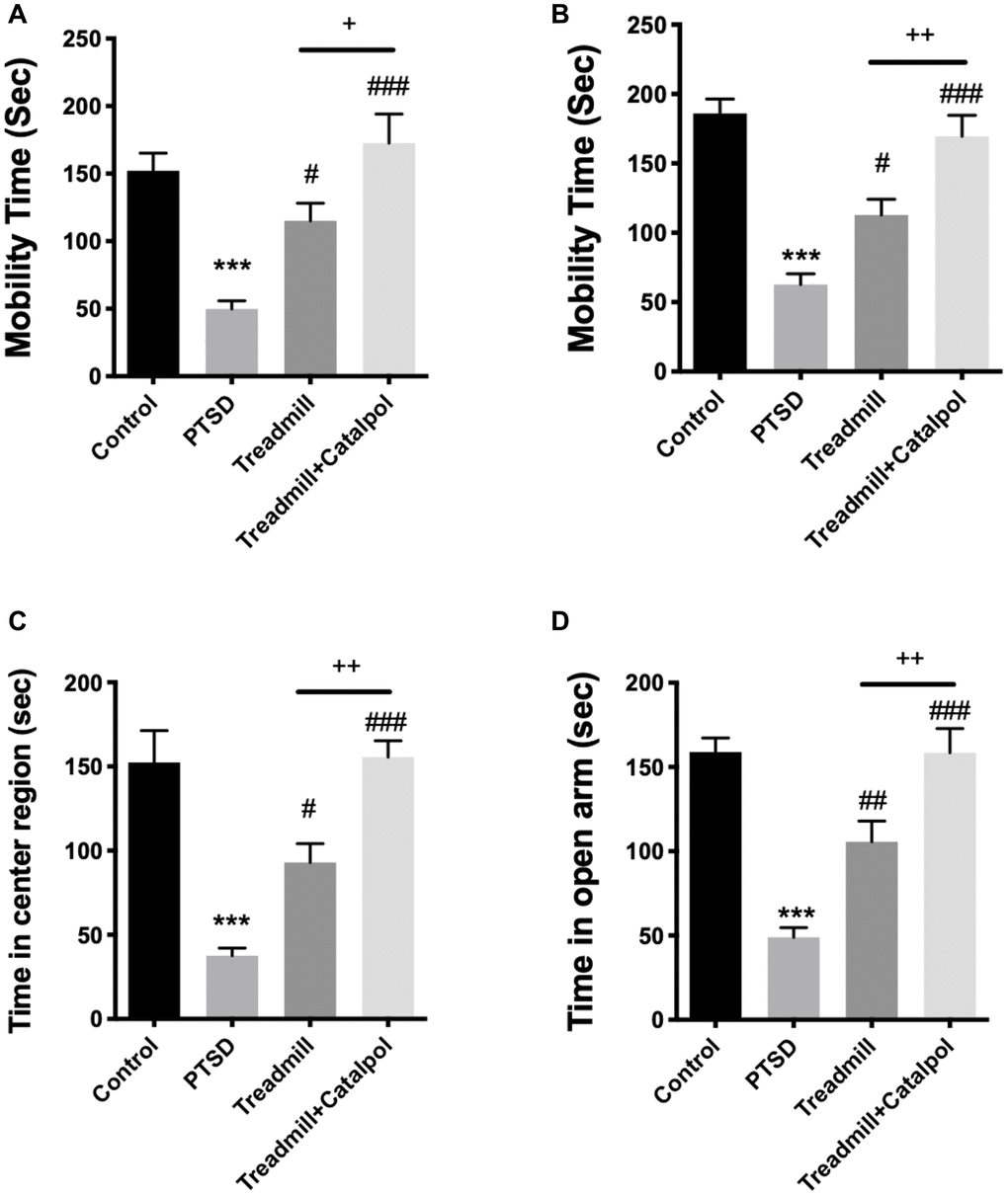 Since PTSD also results in serious dysfunctional antidepressant ability of the subjects, we further tested the depression/anxiety behaviors after the CS tests. As the result showed, the mobility time of the mice were significantly prolonged in treadmill as well as the combined treatment group in both FST and TST (Figure 2A, 2B, one-way ANOVA, FST: treadmill vs. PTSD, p < 0.05; treadmill + catalpol vs. PTSD: p < 0.001; TST: treadmill vs. PTSD, p < 0.05; treadmill + catalpol vs. PTSD: p < 0.001). Compared with the treadmill administration alone, mice treated with treadmill training in combined with the catalpol also showed the remarkable improvement of the mobility (Figure 2A, 2B, one-way ANOVA, FST: treadmill vs. treadmill + catalpol: p < 0.05; T ST: treadmill vs. treadmill + catalpol: p < 0.01). Herein, catalpol could enhance the antidepressant effects of treadmill in PTSD model. On the other side, OFT and EPM were performed to test the anxiety behaviors of the mice. In consistent with the result in FST and TST, the mobility time of the mice in treadmill training plus catalpol treatment and treadmill treatment alone resulted in the significant increasing in compared with PTSD (Figure 2C, 2D, one-way ANOVA, OFT: PTSD vs. treadmill: p < 0.05; PTSD vs. treadmill + catalpol: p < 0.001; EPM: PTSD vs. treadmill: p < 0.01; T PTSD vs. treadmill + catalpol: p < 0.001). Notably, catalpol also significantly improved the anxiolytic effects of treadmill that reflected by the obvious increased time in center region of OFT and the open arm in EPM (Figure 2C, 2D, one-way ANOVA, OFT: treadmill + catalpol vs. treadmill: p < 0.01; EPM: treadmill + catalpol vs. treadmill: p < 0.01). Collectively, catalpol exerts the promotive effects to exercise-induced antidepressant and anxiolytic functions.