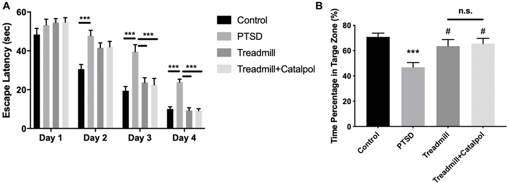 8 weeks adult C57BL/6N male mice were obtained from Laboratory Animal Centre in Beijing Normal University. Mice were raised with ad libitum of tap water as well as food pellets during whole experimental period. All animal was housed in a 12:12 h light/dark cycle. Animal experiment was approved by ethical committee in Beijing Normal University in regard of Guidelines for the Care and Use of Mammals in Neuroscience and Behavioral Research (2003). Temperature (21.6°C) and humidity (24%) were monitored and maintained at a constant level throughout the experiment. To induce the PTSD symptoms, unconditional stimulation combined with conditional stimulation (US-CS) was first performed by pulse the mice with electronic stimulation with a electric foot shock for 5 min (1.5mA) coupled with the conditional noise. In the rest of the day, mice are exposed to noise as CS and the freezing response was recorded. No foot shock was performed for control group during US. Treadmill exercise was performed with the protocol of 20 m/min treadmill (30 min/day). Catalpol treatment was performed with the IP injection with dosage of 20 mg/kg.