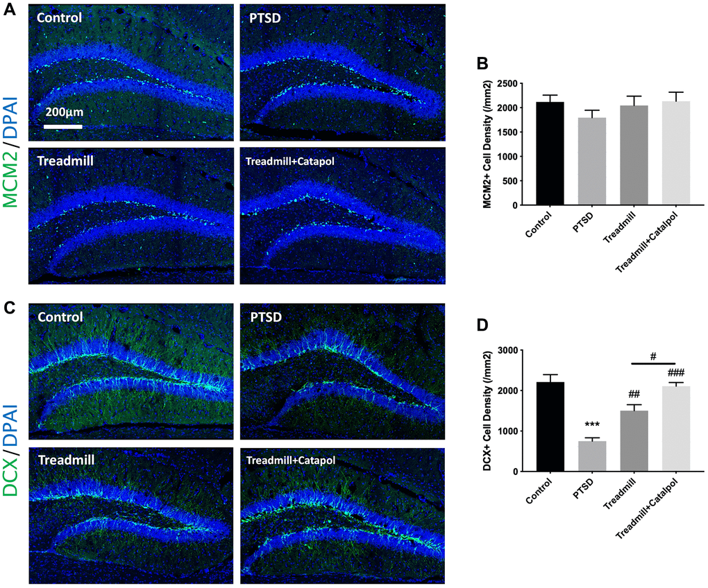 Hippocampal neurogenesis is the key physiological mechanism underlying the emotional and cognitive behaviors [19]. More importantly, the effects of exercise in pro-neurogenesis have been widely reported [20]. Therefore, we further tested the proliferation of NSCs and the neural differentiation by immunofluorescence. We first tested the proliferation profile in the hippocampal DG region. The active NSCs and NPCs, which are almost counted as the proliferating cell types in hippocampus, could be considered as the potential value to reflect the hippocampal neurogenesis. By staining the proliferating cells with MCM2, we detected that the proliferating cells among all treatments showed no significance (Figure 4A, 4B; one-way ANOVA). Doublecortin (DCX) is the biological marker of the immature neurons and neural progenitor cells. We then labelled the hippocampus with DCX for testing the profile of the neural differentiation. As the result indicated, PTSD caused the dramatic decreased DCX density in comparing with control (Figure 4C, 4D; one-way ANOVA, PTSD vs. control: p < 0.001). In compared with PTSD model, the treadmill administration improved the density of the DCX positive immature neurons in hippocampus (Figure 4C, 4D; one-way ANOVA, PTSD vs. treadmill: p < 0.01). While the catalpol combined with treadmill administration resulted in the significant enhanced increase of the DCX positive neural density (Figure 4C, 4D; one-way ANOVA, treadmill + catalpol vs. treadmill: p < 0.001). Based on the effects of catalpol and exercise combination did not improve the NSCs/NPCs proliferation in significant level, the increased DCX positive neural resulted by catalpol as well as the treadmill could be suggested by their effects in promoting the neural fate choice and differentiation of the NSCs.