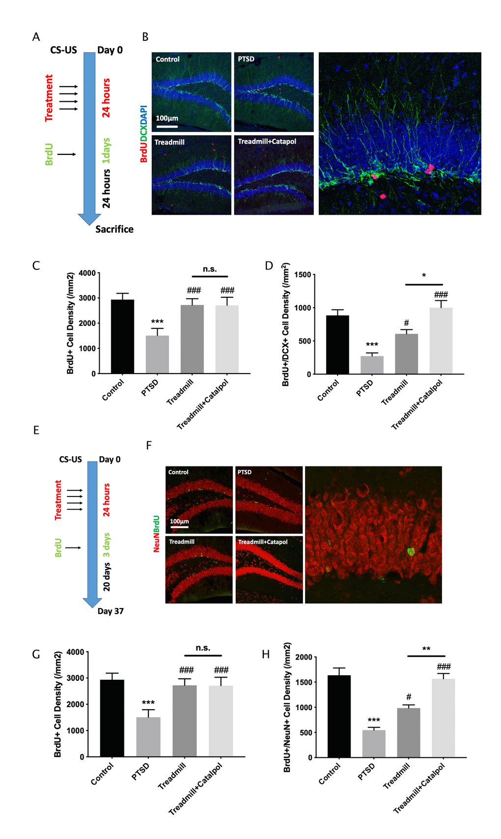Traditional Chinese Medical herbs contains enormous types of compounds with effective neuroprotection. Catalpol is widely reported as its antidepressant effects as well as the pro-neurogenic functions [13, 14]. It was demonstrated that catalpol could perform the antidepressant functions via the BDNF dependent mechanism, which also contributes the neurogenesis regulation in hippocampus [14]. More importantly, catalpol could improve the learning and memory behaviors in cognitive disorder models including attention deficit hyperactivity disorder (ADHD), Parkinson’s disease and Alzheimer’s disease [15, 16]. However, whether catalpol could perform thet therapeutic effects in PTSD in combined with physical exercise remains unknown. Furthermore, what is the role of adult hippocampal neurogenesis in the effects of catalpol to brain functional improvement still not fully understanding.
