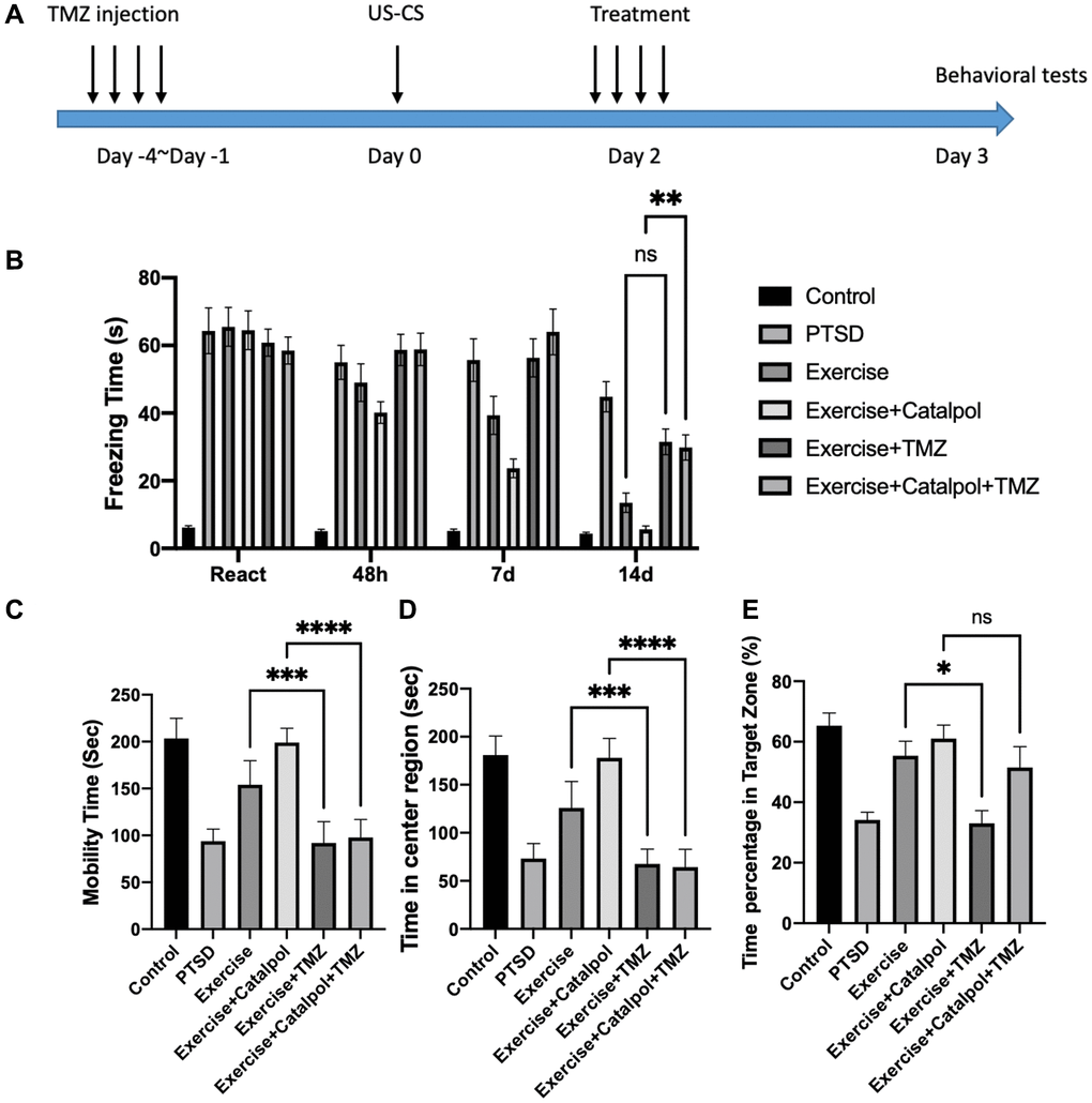 To further analyze the role of adult neurogenesis in regulating effects of catalpol to exercise mediate PTSD therapy, we injected the mice with TMZ to block the cell cycle of the NSCs (Figure 6A). After the treatment of TMZ, we observed that the attenuating effects of exercise combined with catalpol to decrease the CS was compromised (Figure 6B, two-way ANOVA, Tukey’s post-hoc test, 14d catalpol + exercise vs. catalpol + exercise + TMZ: p < 0.001). While no significance showed after TMZ treated with the exercise group. In contrast, the effects of exercise to improve the mobility in FST and to prolong the activity in center region in OFT were all prohibited by treatment of the TMZ (Figure 6C, 5D, one-way ANOVA, Tukey’s post-hoc test, FST, exercise vs. exercise + TMZ: p < 0.001; OFT, exercise vs. exercise + TMZ: p < 0.001). Moreover, TMZ also suppressed the effects of catalpol combination effects in regulating exersise-mediated antidepressant and anxiolytic functions (Figure 6C, 6D, one-way ANOVA, Tukey’s post-hoc test, FST, exercise + catalpol vs. exercise + catalpol + TMZ: p < 0.001; OFT, exercise + catalpol vs. exercise + catalpol + TMZ: p < 0.001). Additionally, we employed the MWM to test the cognitive behavior. After the hidden platform acquisition, in probe trail TMZ treatment dramatically decreased the effects of the exercise in prolong the time of the swim in target zone (Figure 6E, one-way ANOVA, Tukey’s post-hoc test, exercise vs. exercise + TMZ: p < 0.001). However, such effects did not detect in the TMZ treated catalpol combined with exercise (Figure 6E). This provides the evidence that neurogenesis might only plays the critical roles in regulating the effects of exercise to improve panic memory response and emotional functions. Nevertheless, the working memory that regulated by catalpol combined with exercise was not totally depend on adult hippocampal neurogenesis.