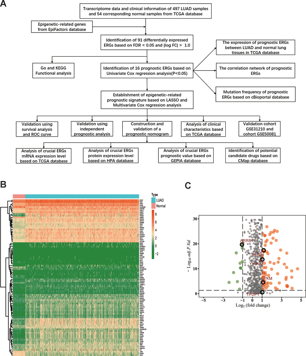 The flow diagram of our study is illustrated in Figure 1A. Firstly, we downloaded mRNA data of 497 LUAD samples and 54 corresponding normal lung samples and corresponding clinical information from the TCGA database. Meanwhile, a total of 720 ERGs were obtained from the EpiFactors database. Then, we matched 720 ERGs with LUAD-related mRNA data, 91 differentially expressed ERGs were identified (|log FC| > 1.0, adjusted P value < 0.05), including 12 downregulated and 79 upregulated ERGs (Figure 1).