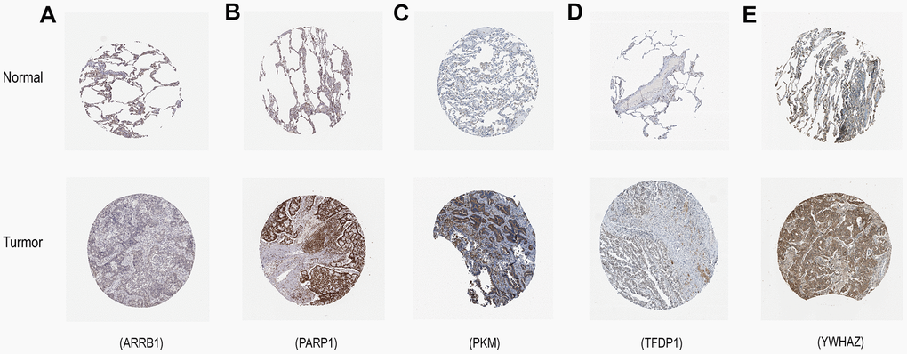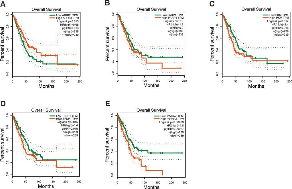 The mRNA expression of the five hub genes in LUAD were analyzed by using the TCGA database. We confirmed that the mRNA expression of PARP1, PKM, TFDP1, and YWHAZ in LUAD tissues were all increased, while ARRB1 was decreased (Figure 10). Moreover, we explored the protein expression of the five hub genes. The results indicated that the protein of PARP1, PKM, TFDP1, and YWHAZ were increased in LUAD tissues, which were in line with their mRNA expression levels (Figure 11). Furthermore, we found that the expression of the three high risk genes (PKM, TFDP1, and YWHAZ) were negatively associated with the prognosis in LUAD, while low risk gene ARRB1 was positive correlation with the prognosis by using the GEPIA database (Figure 12).