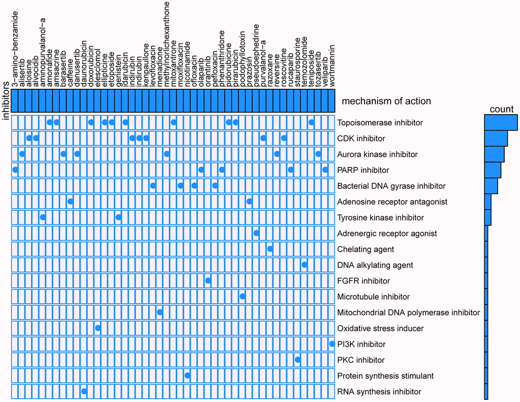 CMap mode-of-action (MoA) analysis found that 47 compounds could be candidate drugs targeting the signature and the drugs shared 18 kinds of mechanisms (Figure 13), ten drugs shared the MoA of topoisomerase inhibitor (amonafide, amsacrine, doxorubicin, ellipticine, etoposide, idarubicin, mitoxantrone, pidorubicine, pirarubicin, teniposide), seven drugs shared the MoA of CDK inhibitor (aloisine, alvocidib, indirubin, indirubin, kenpaullone, purvalanol-a, roscovitine), six drugs shared the MoA of aurora kinase inhibitor (alisertib, barasertib, danusertib, methylnorlichexanthone, reversine, tozasertib), and five drugs shared the MoA of PARP inhibitor (olaparib, phenanthridone, rucaparib, veliparib, 3-amino-benzamide).