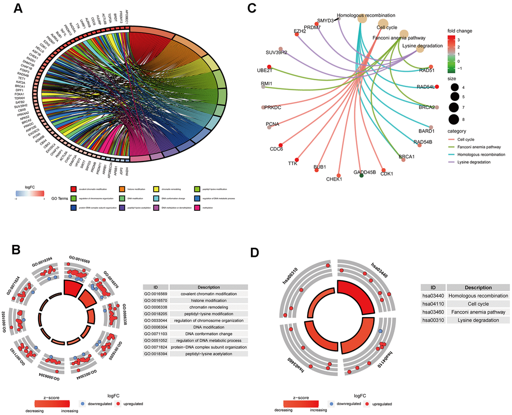 GO analysis results indicated that 91 ERGs were mainly enriched in 422 Go terms, such as covalent chromatin modification, histone modification, chromatin remodeling, peptidyl-lysine modification, regulation of chromosome organization and so forth (Figure 2A, 2B). KEGG analysis results demonstrated that 91 ERGs were mainly enriched in 4 pathways including homologous recombination, cell cycle, lysine degradation and fanconi anemia (Figure 2C, 2D).
