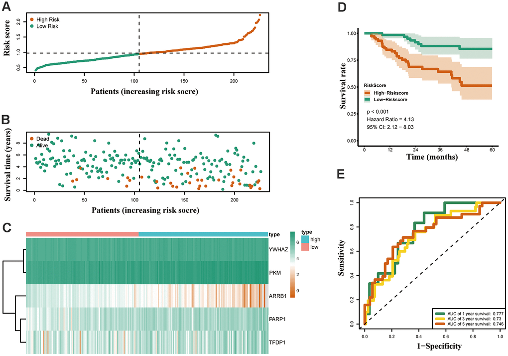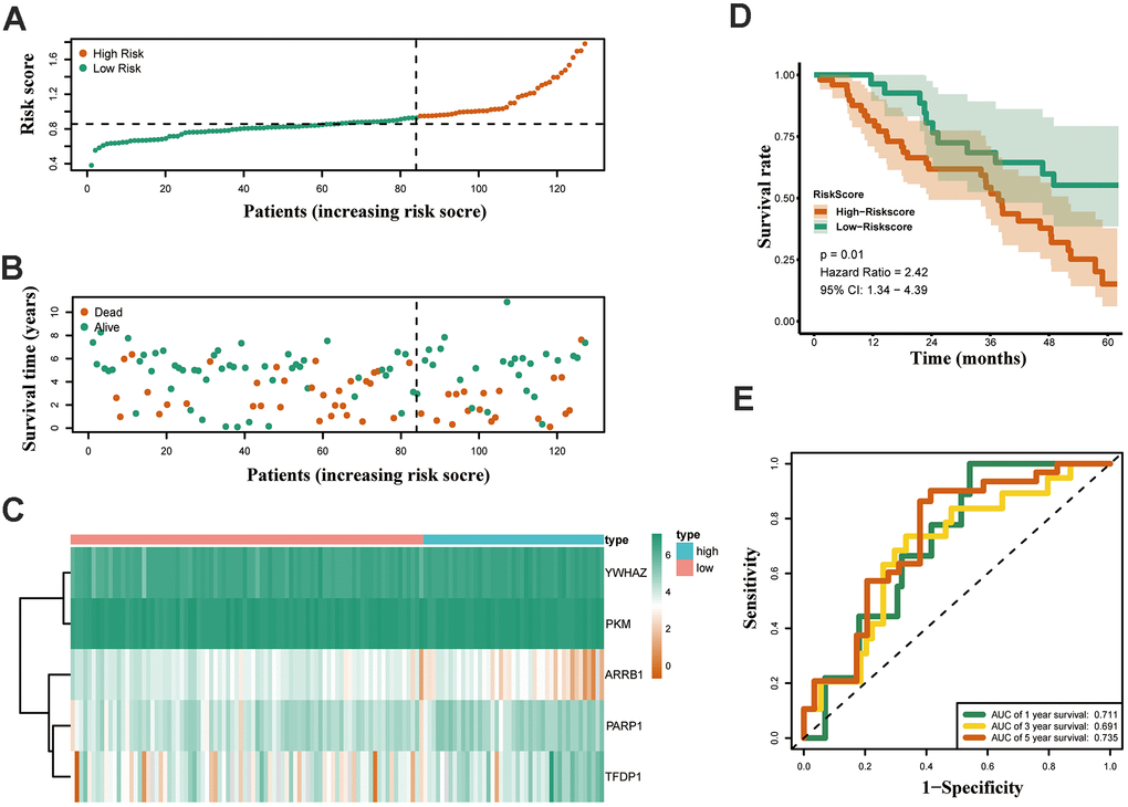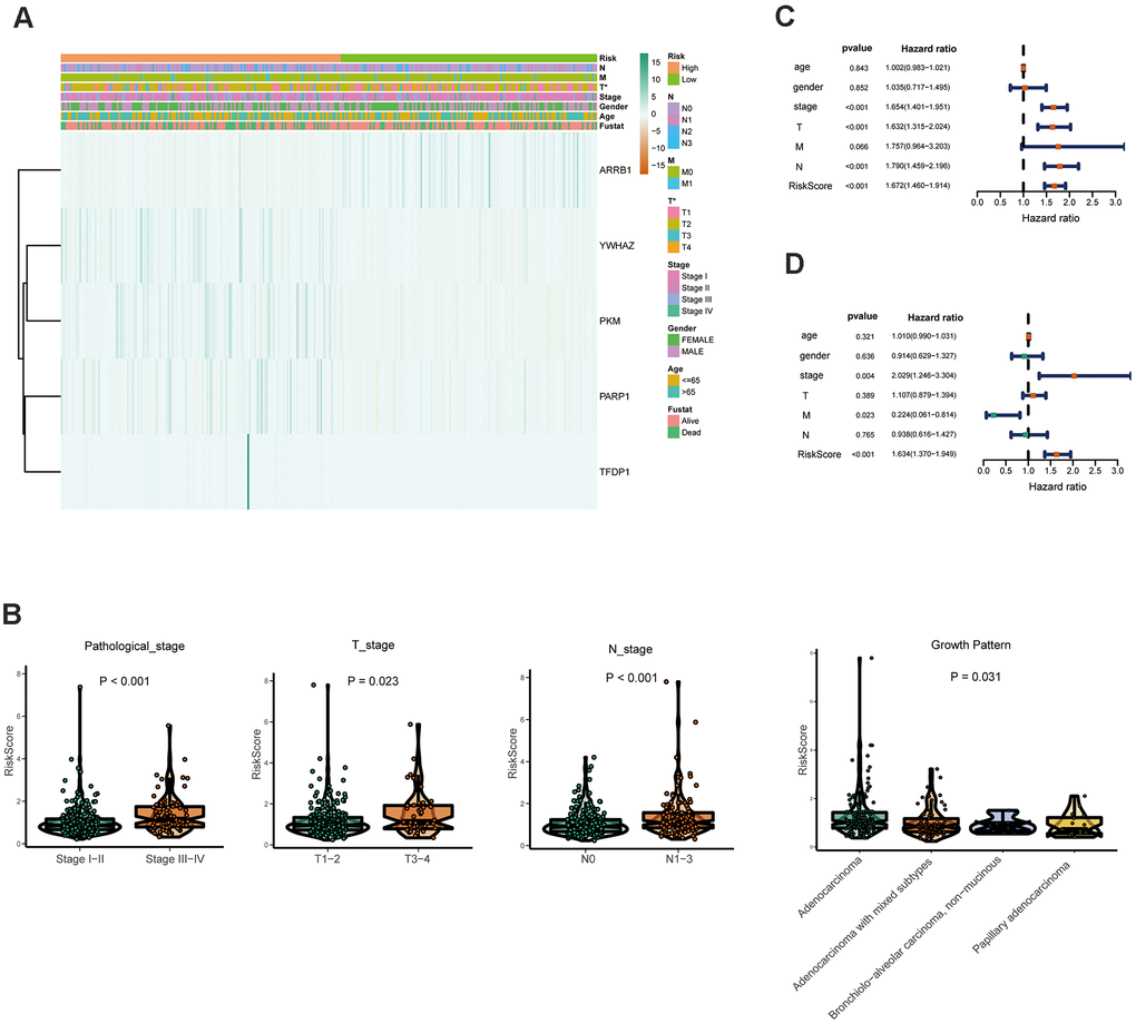 Furthermore, the expression of the five crucial genes and clinicopathological factors in high and low risk groups are presented in Figure 6A. The results indicated that with reduction of the risk score, ARRB1 was gradually increased, while YWHAZ, PKM, PARP1, and TFDP1 were gradually decreased. Significant differences were found for the pathologic T stage between the high and low risk groups. Moreover, a higher risk score was associated with higher pathological stage, N-stage and some histological growth patterns, including adenocarcinoma, adenocarcinoma with mixed subtypes, bronchioloalveolar carcinoma, non-mucinous, and papillary adenocarcinoma (Figure 6B).