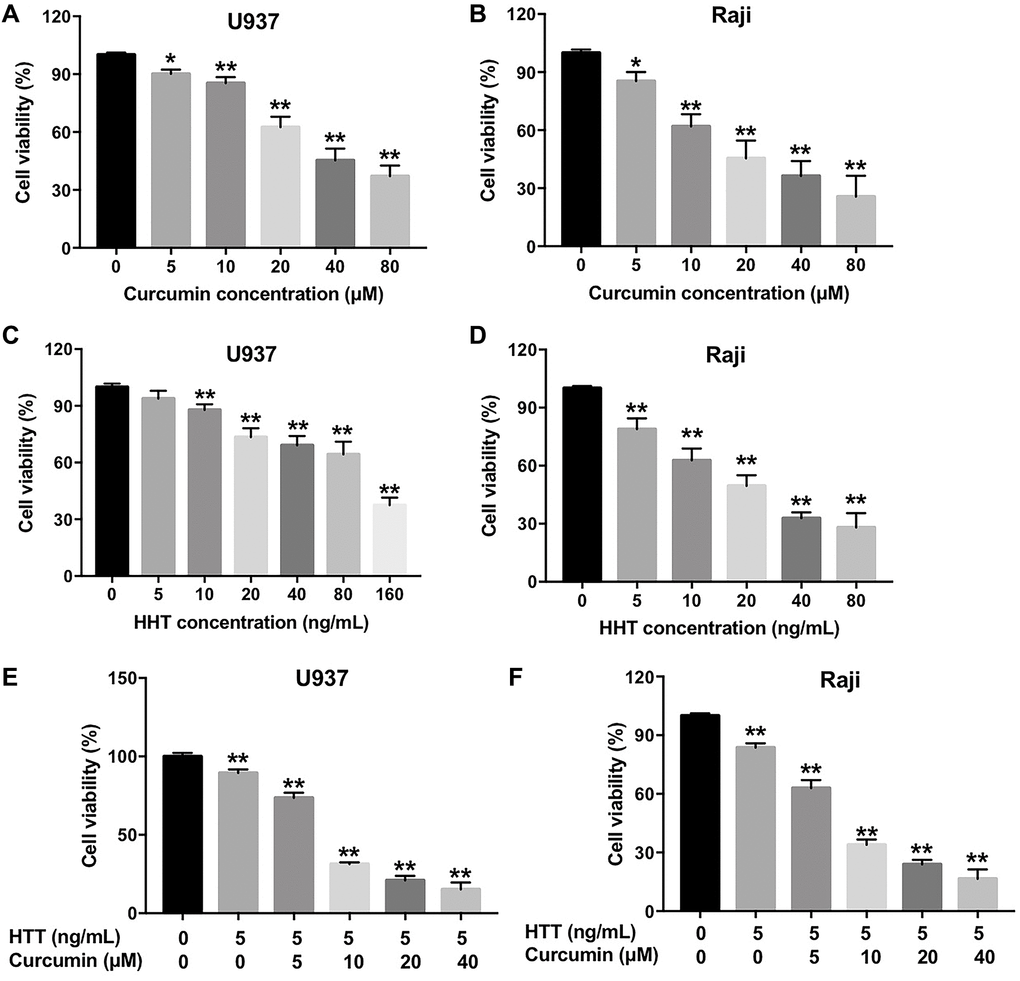 The Chou–Talalay method was used to calculate combination index (CI) values for the drug combination [47]. U937 and Raji cells were exposed to solutions containing curcumin (0, 5, 10, 20, or 40 μM) combined with HHT (5 ng/mL). The CI value for the combination of curcumin and HHT in lymphoma was defined as CI = DA/ICx, A + DB/ICx, B [48].