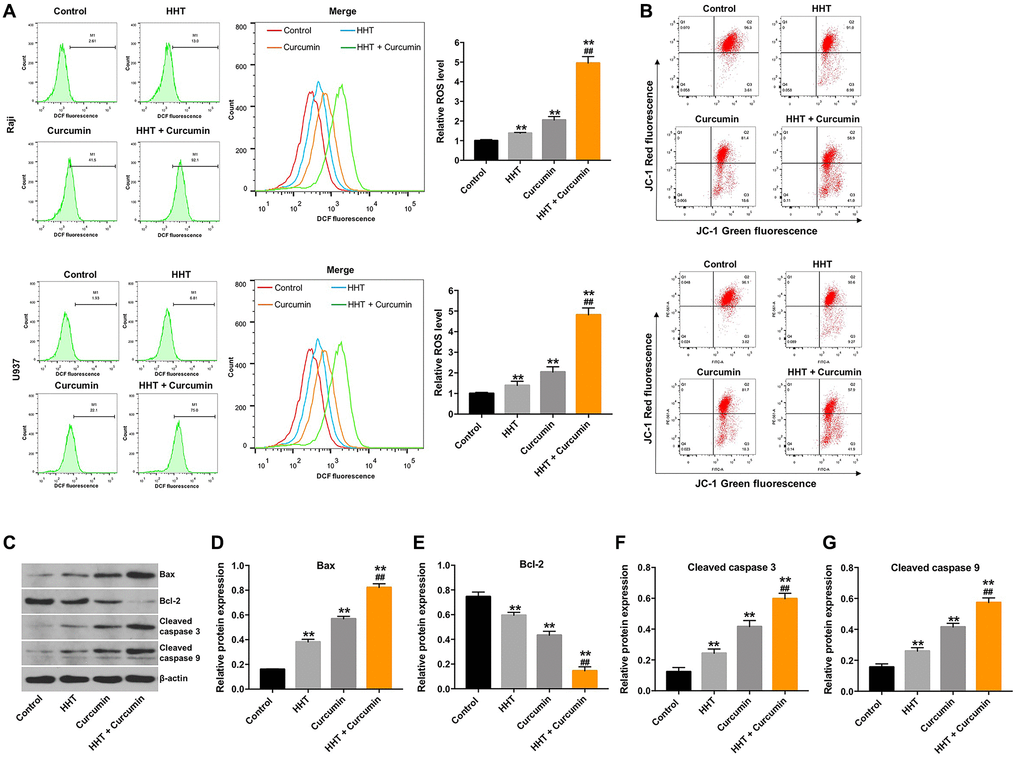 To assess whether lymphoma cell death induced by HHT/curcumin combination was accompanied by enhanced ROS generation, Raji cells were stained with DCFH-DA. As shown in Figure 3A, combination of HHT and curcumin remarkedly increased ROS generation in Raji cells (4.95 fold) and U937 cells (4.82 fold) compared to the HHT (1.38 fold and 1.39 fold, respectively) alone treatment group (Figure 3A). In addition, JC-1 staining indicated that the combination treatment obviously decreased MMP in Raji and U937 cells (Figure 3B). Meanwhile, combination of HHT and curcumin markedly increased Bax, cleaved caspase 3, and cleaved caspase 9 expression and decreased Bcl-2 expression in Raji cells (Figure 3C–3G). These data demonstrate that combination of curcumin and HHT induced apoptosis of lymphoma cells via the mitochondrial-mediated apoptosis pathway.