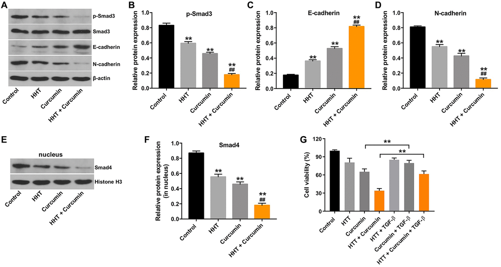 TGF-β/Smad signaling participates in various biological processes, including cancer cell growth, migration, and invasion [33]. We therefore assessed p-Smad3, E-cadherin, and N-cadherin expression in Raji cells using a Western blotting assay. As indicated in Figure 4A–4D, combination of HHT and curcumin significantly decreased p-Smad3 and N-cadherin levels and markedly increased E-cadherin levels in Raji cells. Meanwhile, the combination treatment decreased nuclear accumulation of Smad4 in Raji cells (Figure 4E and 4F). To investigate whether TGF-β signaling is involved in combination treatment-mediated lymphoma cell growth, rescue experiments were performed. As shown in Figure 4G, the inhibitory effect of combination treatment on the viability of Raji cells was reversed by the administration of TGF-β. These data suggest that combination of curcumin and HHT inhibited lymphoma cell growth by inhibiting the TGF-β/Smad3 signaling pathway.