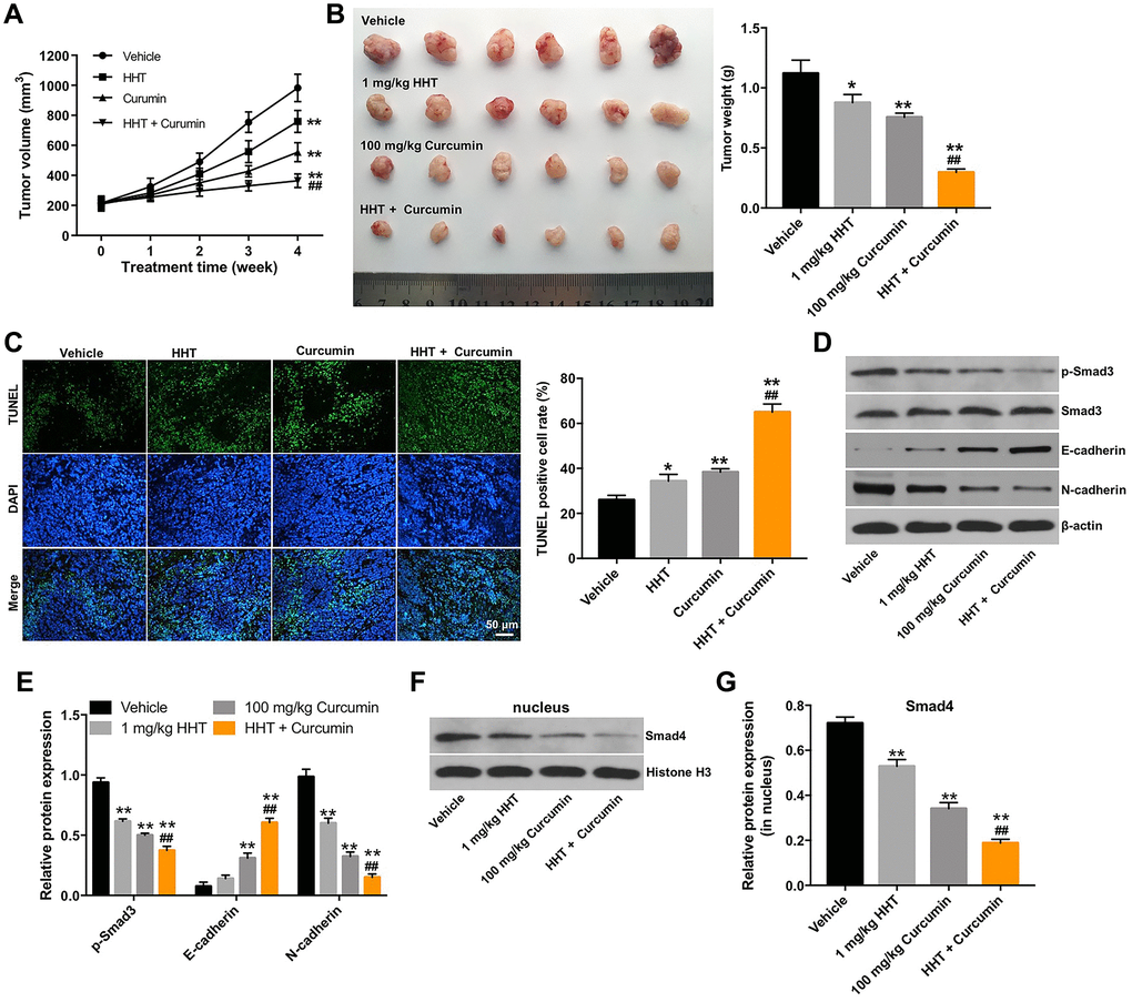 Next, we further assessed the effects of HHT combined with curcumin in a mouse Raji xenograft in vivo model. As shown in Figure 5A and 5B, the combination treatment markedly decreased the tumor volume and tumor weight of transplanted Raji tumors in vivo. In addition, a TUNEL assay revealed that combined treatment notably increased cell apoptosis in tumor tissues compared to the HHT alone treatment group (Figure 5C). Meanwhile, Western blots indicated that the combination treatment decreased the expressions of p-Smad3 and N-cadherin, increased the expression of E-cadherin, and reduced nuclear accumulation of Smad4 in tumor tissues (Figure 5D–5G). These results indicate that combination of curcumin with HHT inhibited tumorigenesis in Raji xenografts in vivo.