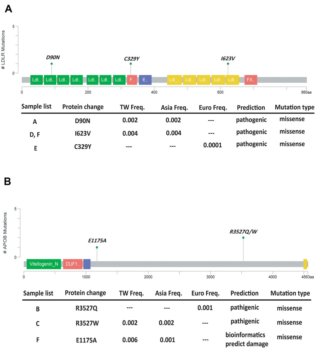 There were six pathogenic variants identified in 6 stroke patients with higher LDL-C level (Supplementary Table 2), and all resulted in a missense mutation. The located functional domains were depicted in Figure 1. Three of them were LDLR variants: c.268G>A, c.1867A>G, and c.986G>A. The other three were the APOB variants: c.10580G>A, c.10579C>T, and c.3524A>C. Only one variant, c.1867A>G, was relatively frequent in the database of Taiwan’s biobank, with a minor allele frequency of around 0.3%. The other variants were relatively rare in Taiwan’s population, with a minor allele frequency equal to or less than 0.1%. No pathogenic variants of PCSK9 were identified in any subject. Among six patients, one carried two pathogenic variants located on APOB and LDLR genes. There were two cases carrying the same mutation of LDLR.