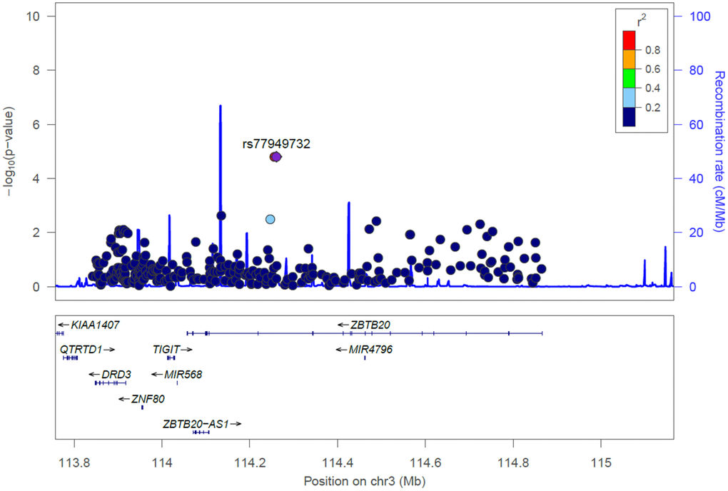 Interestingly, the present study is the first to raise the possibility that three significant SNPs in the DRD3-LOC107986115-ZNF80-TIGIT-MIR568-ZBTB20 locus, such as rs145272406 in ZBTB20, rs114295131 in ZBTB20, and rs77949732 in ZBTB20, may be associated with cognitive aging. To our knowledge, no other studies have been conducted to pinpoint these three SNPs in ZBTB20 with cognitive aging or age-related cognitive decline. The ZBTB20 gene, located on chromosome 3q13.31, represents the DRD3-LOC107986115-ZNF80-TIGIT-MIR568-ZBTB20 locus. ZBTB20 is a good candidate for cognitive aging. For example, it has been reported that mutations in ZBTB20 are associated with Primrose syndrome, a genetic disorder characterized by intellectual disability, autism, and other behavioral concerns [18]. On another note, ZBTB20 has been previously implicated in influencing neurodevelopmental disorders in subjects of European ancestry [36]. Animal studies also revealed that the Zbtb20 gene is mainly expressed in brain and its encoded protein is implicated in hippocampal development and cerebellar granule cells [37, 38].
