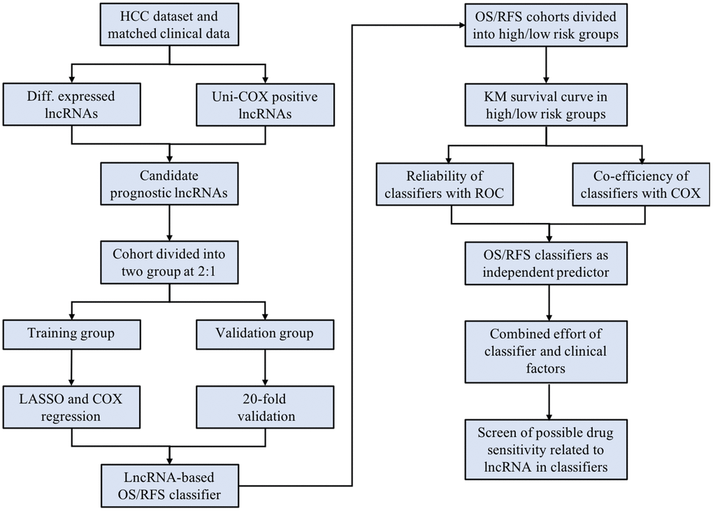 Therefore, this study aims to develop a lncRNA-based tool to monitor and predict the outcomes of HCC. In detail, the HCC cohort containing lncRNA expression and clinical data was acquired from public databases. Two lncRNA-based signatures: an 8-lncRNA contained classifier for overall survival (OS) prediction and a 6-lncRNA contained classifier for relapse-free survival (RFS) prediction, were constructed by applying COX and LASSO regression with differentially expressed lncRNAs (DElncRNAs). Subsequently, the ability as prognostic predictors of both classifiers was evaluated and compared with traditional staging systems. Last but not least, as the cohort was divided into high- and low-risk groups according to the risk score determined by the signature classifiers, potential therapeutic targets and small molecules for high-risk, poor prognosis-associated patients were explored with methods described below (Figure 1).